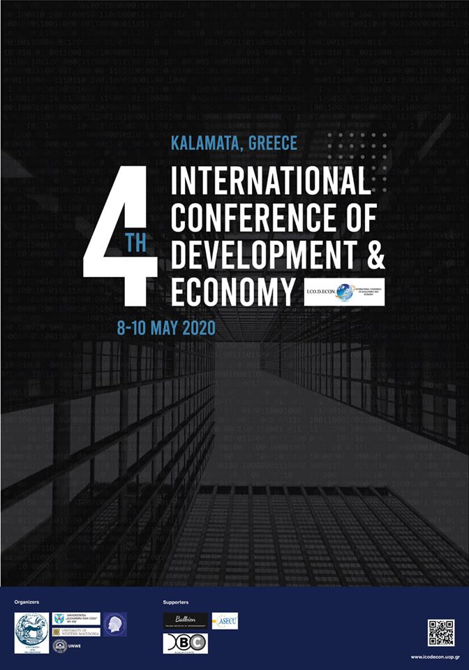 We are happy to announce the 4th International Conference of Development and Economy (I.CO.D.ECON.), which is organized by the University of Peloponnese (Greece) and co-organized by the University of National and World Economy of Sofia (Bulgaria), the University of Western Macedonia (Greece), the University Alexandru Ioan Cuza of Iasi (Romania) and the Democritus University of Thrace (Greece).