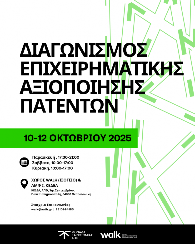 Η Μονάδα Μεταφοράς Τεχνολογίας και Καινοτομίας του ΑΠΘ και το WALK Κέντρο Επιχειρηματικότητας και Καινοτομίας σας προσκαλούν να συμμετάσχετε ενεργά στον Διαγωνισμό Επιχειρηματικής Αξιοποίησης Πατεντών, που θα υλοποιηθεί στο πλαίσιο ενίσχυσης δράσεων επιχειρηματικότητας, καινοτομίας & μεταφοράς τεχνολογίας του ΑΠΘ, 10-12 Οκτωβρίου 2025.