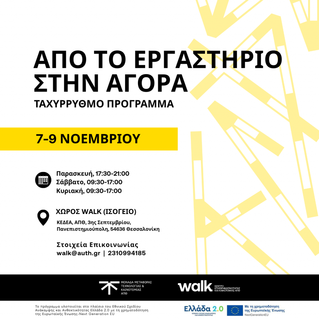 Η Μονάδα Μεταφοράς Τεχνολογίας και Καινοτομίας του ΑΠΘ και το WALK Κέντρο Επιχειρηματικότητας και Καινοτομίας σας προσκαλούν να συμμετάσχετε ενεργά στο ταχύρρυθμο πρόγραμμα “Από το Εργαστήριο στην Αγορά” που θα πραγματοποιηθεί 7-8-9 Νοεμβρίου 2025, στο πλαίσιο ενίσχυσης των δράσεων επιχειρηματικότητας, καινοτομίας και μεταφοράς τεχνολογίας του ΑΠΘ.