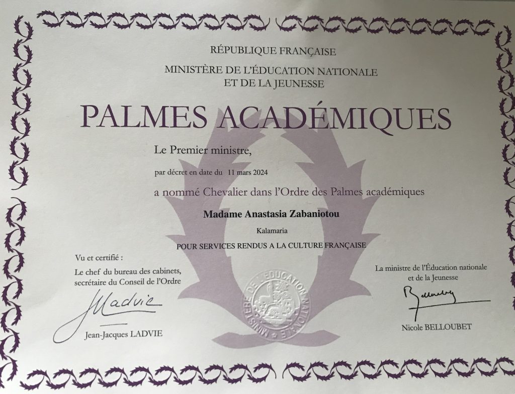 Στις 13 Δεκεμβρίου 2024, στο Γαλλικό Ινστιτούτο της Θεσσαλονίκης, παρουσία της οικογένειας, φίλων και συναδέλφων, έγινε η απονομή του παρασήμου του ‘Ιππότη του Τάγματος των Ακαδημαϊκών Φοινίκων’ εκ μέρους του Υπουργού Εθνικής Παιδείας της Γαλλικής Δημοκρατίας, από τον Γενικό Πρόξενο της Γαλλίας κ. Jean-Luc Lavaud, στην Oμότιμη Kαθηγήτρια του ΑΠΘ Αναστασία Ζαμπανιώτου, για την δια βίου μου συνεισφορά της στην προώθηση της πανεπιστημιακής Γάλλo-ελληνικής Πανεπιστημιακής συνεργασίας, της γαλλικής γλώσσας και του πολιτισμού της.