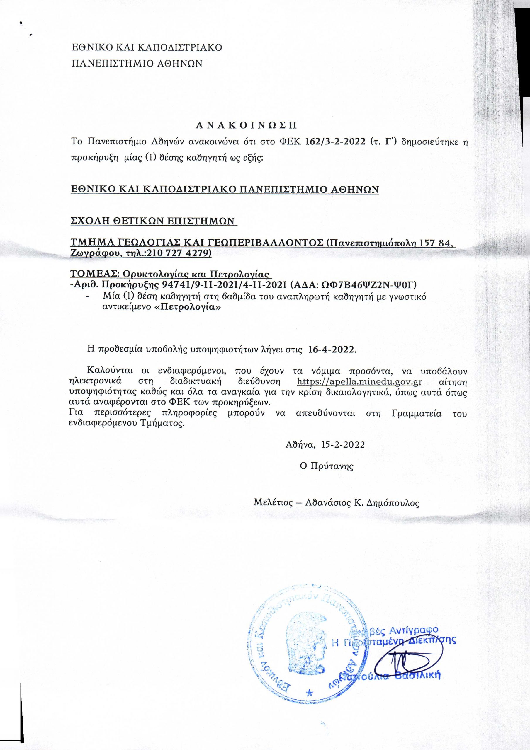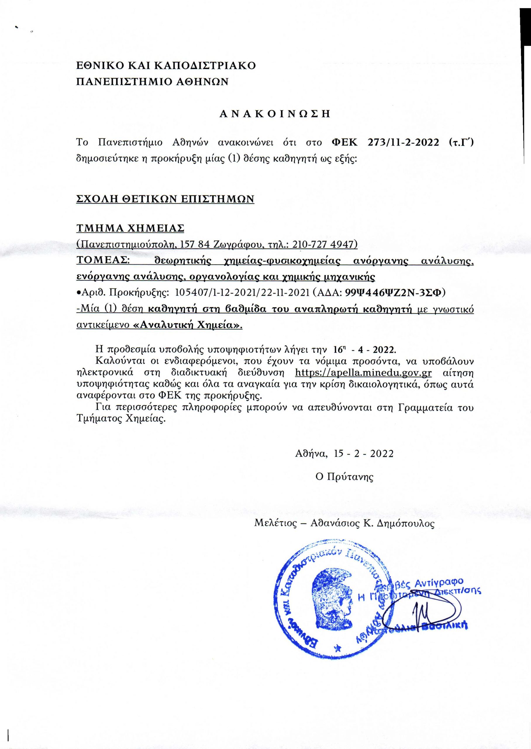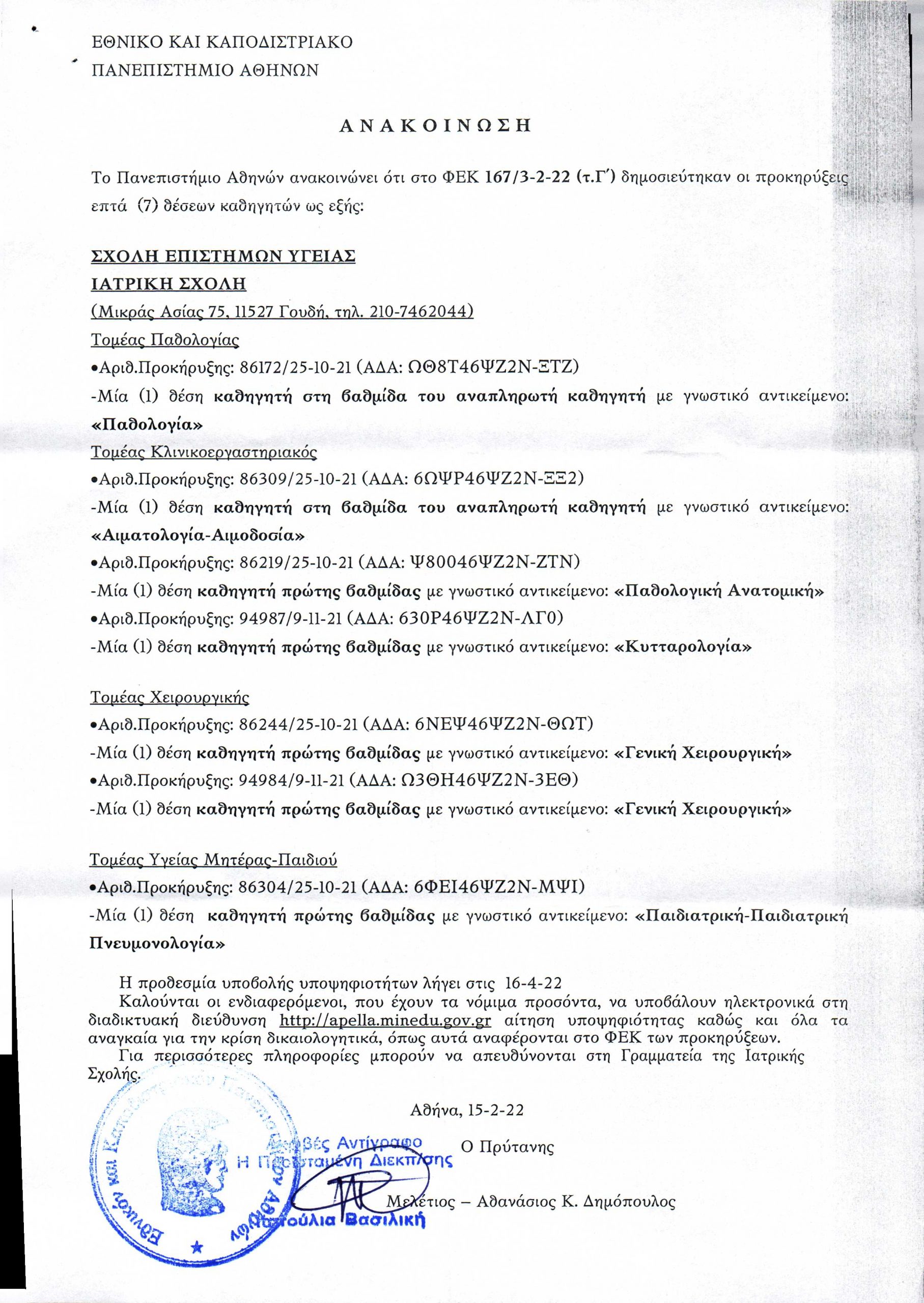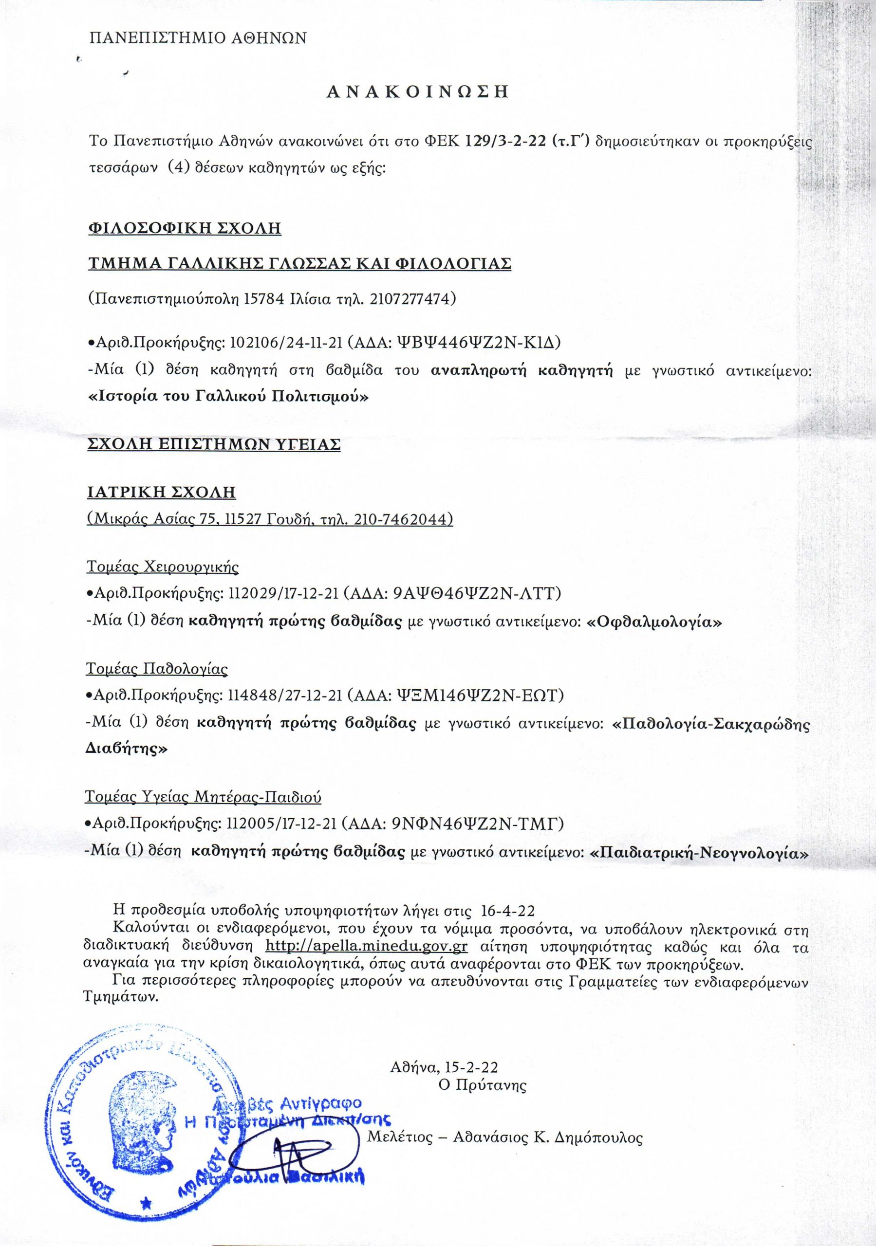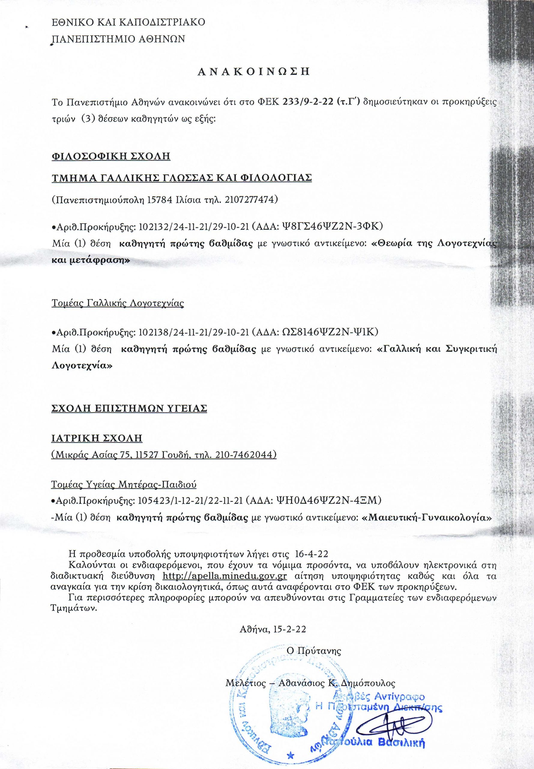 Δημοσίευση ανακοινώσεων προκηρύξεων για την πλήρωση θέσεων μελών ΔΕΠ στο Εθνικό και Καποδιστριακό Πανεπιστήμιο Αθηνών.