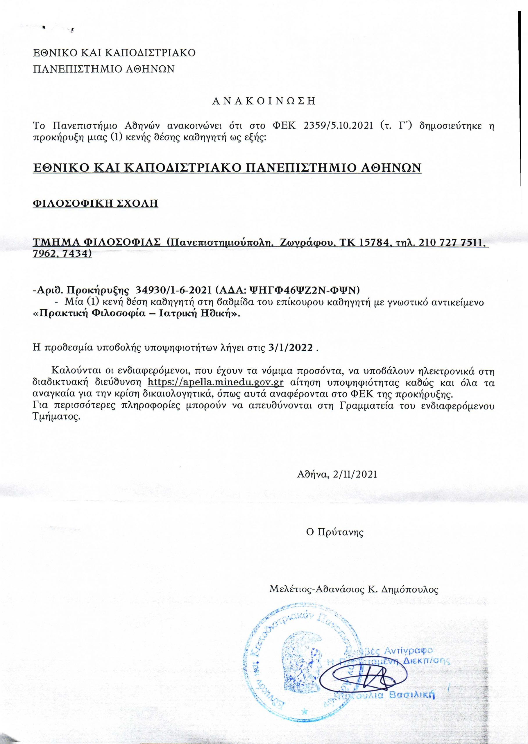 Δημοσίευση ανακοίνωσης προκήρυξης μίας (1) κενής θέσης καθηγητή του Εθνικού και Καποδιστριακού Πανεπιστημίου Αθηνών