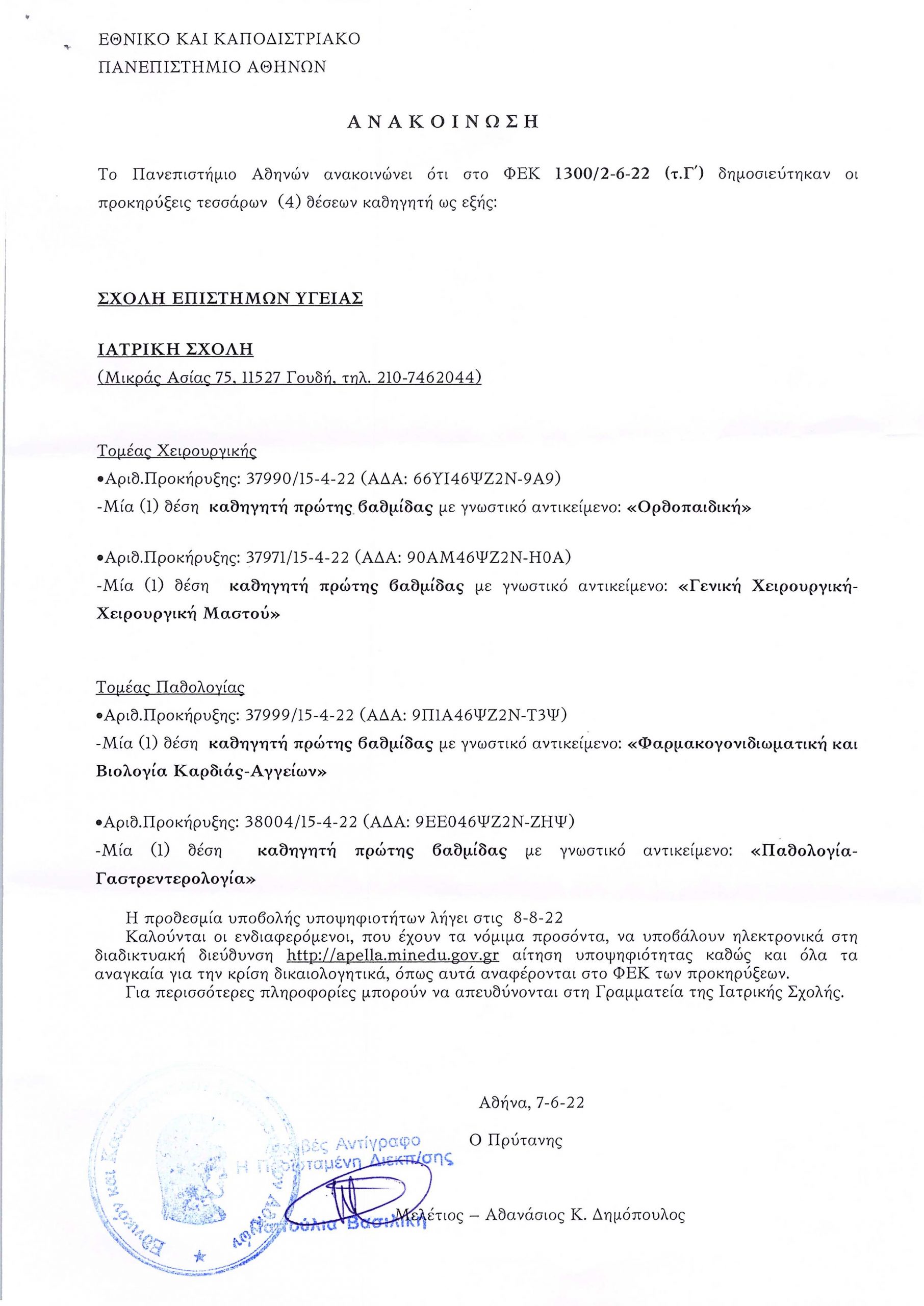 Δημοσίευση προκηρύξεων για την πλήρωση τεσσάρων (4) θέσεων μελών ΔΕΠ στο Εθνικό και Καποδιστριακό Πανεπιστήμιο Αθηνών.