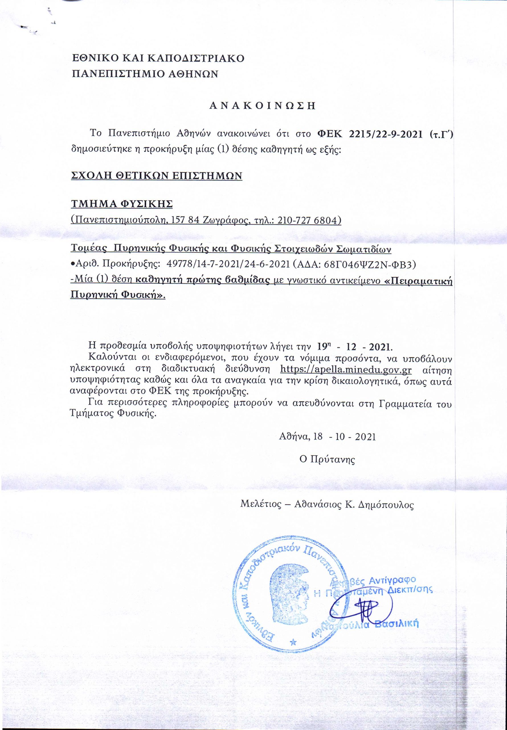 Δημοσίευση προκήρυξης μίας (1) θέσης καθηγητή του Εθνικού και Καποδιστριακού Πανεπιστημίου Αθηνών
