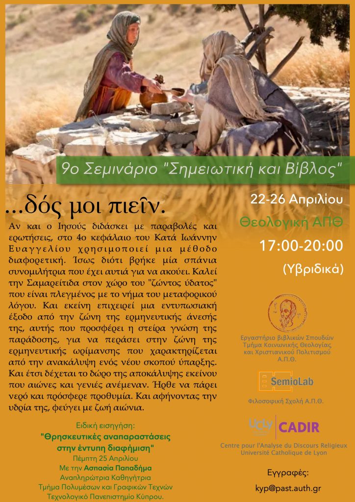Το Εργαστήριο Βιβλικών Σπουδών (Biblical Studies Lab) του Τμήματος Κοινωνικής Θεολογίας και Χριστιανικού Πολιτισμού Α.Π.Θ. διοργανώνει το 9ο Σεμινάριο «Σημειωτική και Βίβλος», το οποίο αναπτύσσει θέματα εφαρμογής της σημειωτικής θεωρίας σε κείμενα της Βίβλου, με σκοπό την ερμηνευτική της κατανόηση με σύγχρονους τρόπους προσέγγισης του νοήματός της. Το σεμινάριο γίνεται σε συνεργασία με το Εργαστήριο Σημειωτικής (SemioLab) της Φιλοσοφικής Σχολής Α.Π.Θ. και με το Κέντρο Ανάλυσης Θρησκευτικού Λόγου (CADIR) της Θεολογικής Σχολής του Καθολικού Πανεπιστημίου της Λυών. Οι ημερομηνίες διεξαγωγής είναι 22-23-24-25-26 Απριλίου 2024, ώρες 17.00-20.00, στη Θεολογική Σχολή Θεσσαλονίκης.