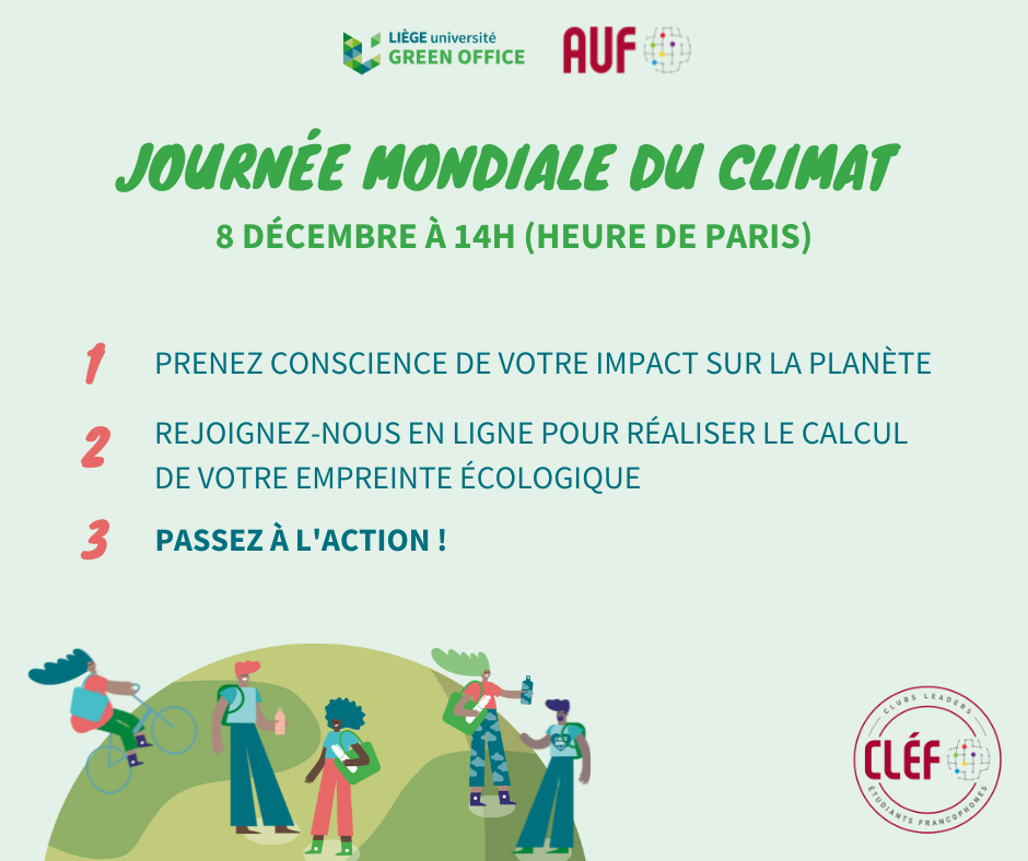 Στο πλαίσιο των δράσεων για την Παγκόσμια ημέρα για το κλίμα, στις 8 Δεκεμβρίου 2022, η Agence Universitaire de la Francophonie (AUF), σας προσκαλεί να μετρήσετε το οικολογικό σας αποτύπωμα ώστε να λάβετε μέτρα για τη μείωσή του. Η δράση θα πραγματοποιηθεί διαδικτυακά.
