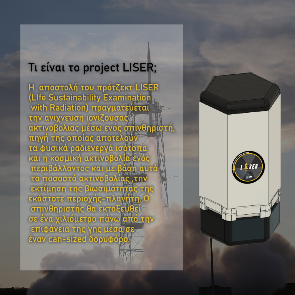 Η αποστολή του πρότζεκτ LISER (Life Sustainability examination with Radiation) πραγματεύεται την ανιχνευση ιονιζουσας ακτινοβολίας μέσω ενός σπινθηριστή, πηγή της οποίας αποτελούν τα φυσικά ραδιενεργά ισότοπα και η κοσμική ακτινοβολία ενός περιβάλλοντος και με βάση αυτό το ποσοστό ακτινοβολίας ,την εκτίμηση της βιωσιμότητας της εκάστοτε περιοχής-πλανήτη. Ο σπινθηριστής θα εκτοξευθεί σε ένα χιλιόμετρο πάνω από την επιφάνεια της γης μέσα σε έναν can-sized δορυφόρο.