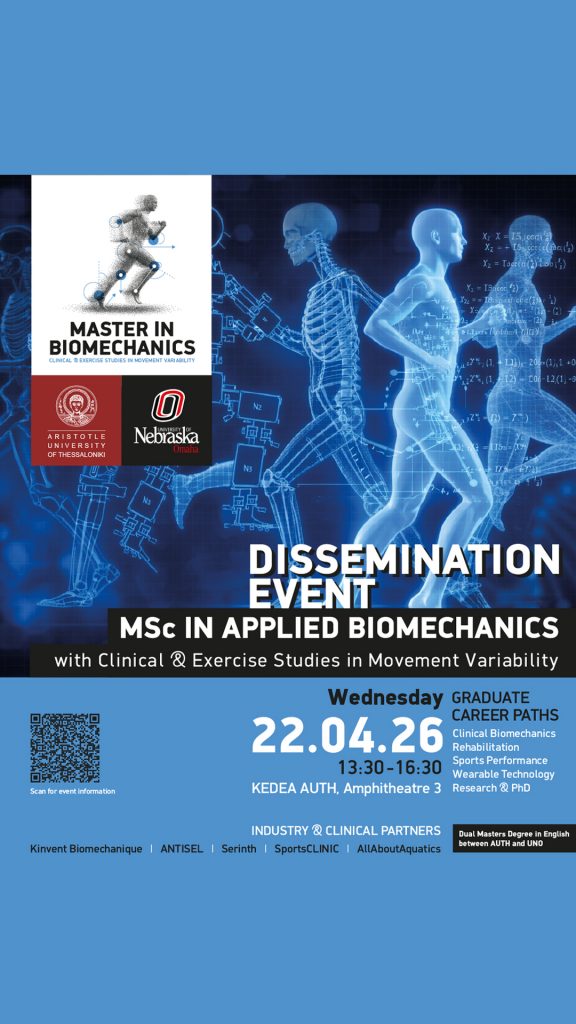Στο πλαίσιο της διάχυσης και της παρουσίασης του νέου Διιδρυματικού Προγράμματος Μεταπτυχιακών Σπουδών (Δ.Π.Μ.Σ.) του Α.Π.Θ. και του University of Nebraska Omaha (U.S.A.) με τίτλο «Applied Biomechanics with Clinical and Exercise Studies in Movement Variability» θα πραγματοποιηθεί ημερίδα με θέμα «Εφαρμοσμένη Εμβιομηχανική με Κλινικές και Αθλητικές Μελέτες στη Μεταβλητότητα της Κίνησης» στο Αμφιθεάτρο ΙΙΙ του ΚΕ.Δ.Ε.Α. Α.Π.Θ. την Τετάρτη 22 Απριλίου 2026 και ώρα 13:30 – 16:30.