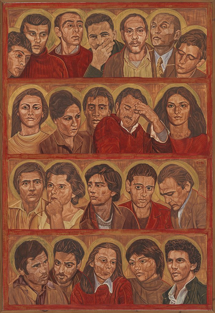 Σούλα Πιτέρη, Τάξεις δικαίων, 1986, λάδι, 111,5×76 εκ. Συλλογή Σούλας Πιτέρη. Εκτέθηκε σε ομαδική έκθεση Θεσσαλονικέων καλλιτεχνών της Μικρής Πινακοθήκης ΔΙΑΓΩΝΙΟΣ (27/10-7/11/1986)