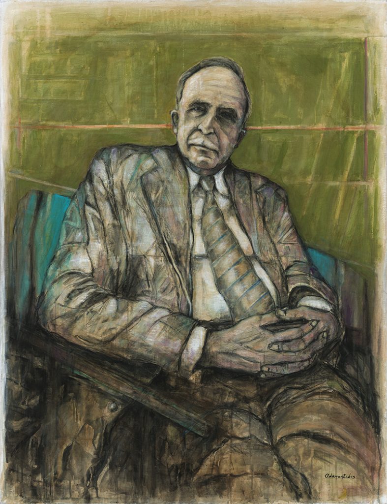 Γιάννης Αδαμαντίδης, Ντίνος Χριστιανόπουλος, 2021, λάδι, 130×100 εκ. Συλλογή Τελλογλείου Ιδρύματος Τεχνών ΑΠΘ, δωρεά του καλλιτέχνη