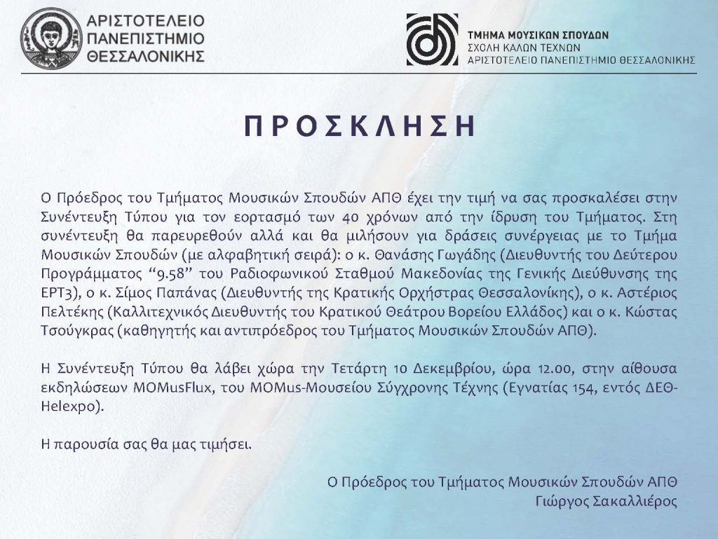 Το Τμήμα Μουσικών Σπουδών ΑΠΘ πρόκειται να διοργανώσει Συνέντευξη Τύπου για τον εορτασμό των 40 χρόνων από την ίδρυσή του. Στη συνέντευξη θα παρευρεθούν αλλά και θα μιλήσουν για δράσεις συνέργειας με το Τμήμα Μουσικών Σπουδών (με αλφαβητική σειρά): ο κ. Θανάσης Γωγάδης (Διευθυντής του Δεύτερου Προγράμματος “9.58” του Ραδιοφωνικού Σταθμού Μακεδονίας της Γενικής Διεύθυνσης της ΕΡΤ3), ο κ. Σίμος Παπάνας (Διευθυντής της Κρατικής Ορχήστρας Θεσσαλονίκης), ο κ. Αστέριος Πελτέκης (Καλλιτεχνικός Διευθυντής του Κρατικού Θεάτρου Βορείου Ελλάδος) ο Γιώργος Σακαλλιέρος (καθηγητής και πρόεδρος του Τμήματος Μουσικών Σπουδών ΑΠΘ) και ο κ. Κώστας Τσούγκρας (καθηγητής και αντιπρόεδρος του Τμήματος Μουσικών Σπουδών ΑΠΘ).