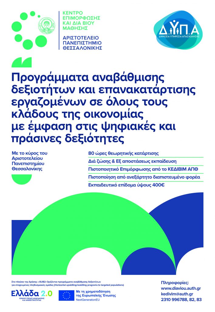 Το ΚΕΔΙΒΙΜ ΑΠΘ συμμετέχει στην Πρόσκληση της ΔΥΠΑ (Δημόσια Υπηρεσία Απασχόλησης) με τίτλο “Προγράμματα αναβάθμισης δεξιοτήτων και επανακατάρτισης εργαζομένων σε όλους τους κλάδους της οικονομίας με έμφαση στις ψηφιακές και πράσινες δεξιότητες, στο πλαίσιο της δράσης: «SUB2: Οριζόντια προγράμματα αναβάθμισης δεξιοτήτων για στοχευμένες πληθυσμιακές ομάδες (Horizontal upskilling/reskilling programs to targeted populations).