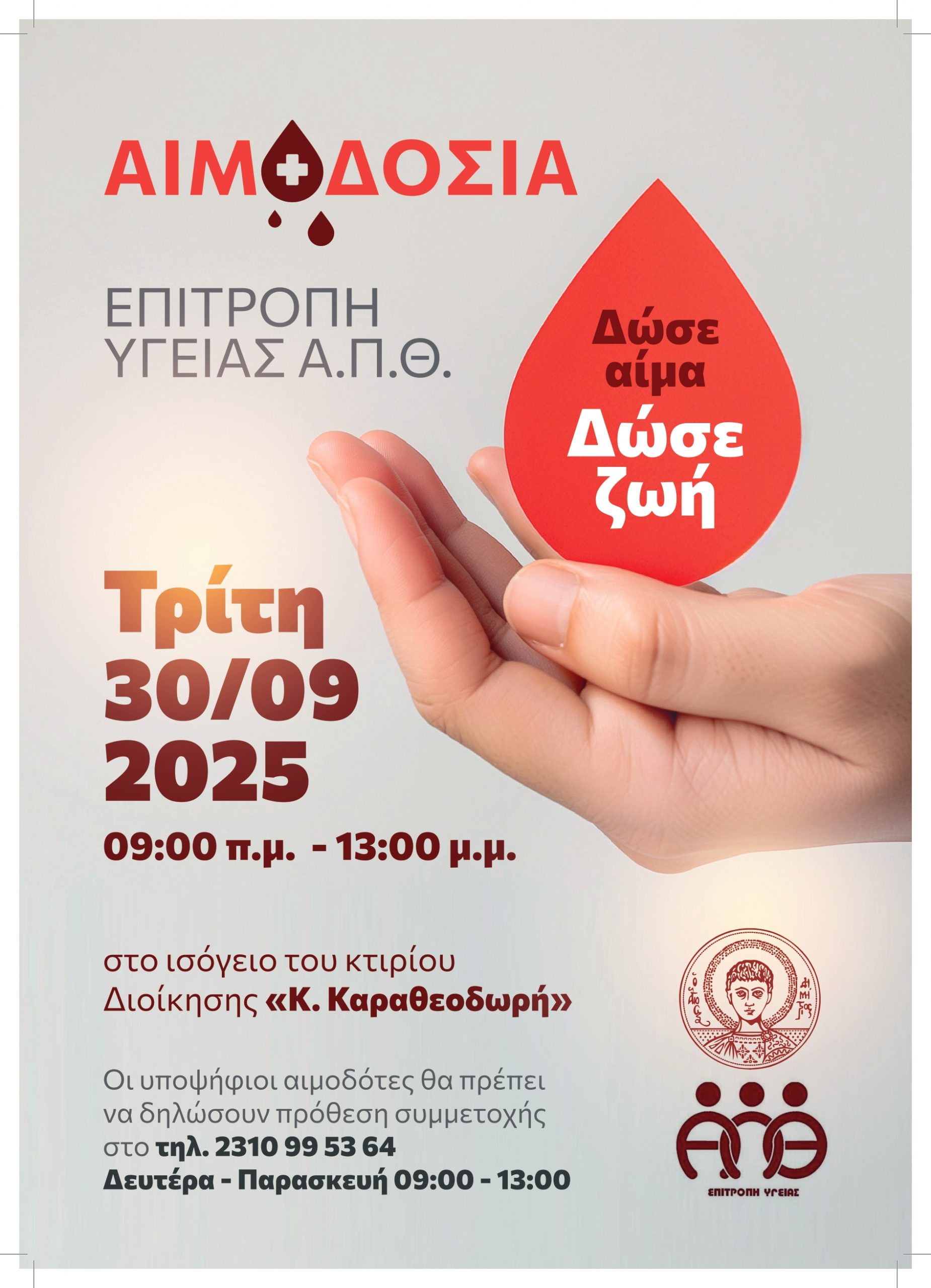 Οι υποψήφιοι/ιες αιμοδότες/τριες θα πρέπει να δηλώσουν τη συμμετοχή τους στο τηλέφωνο 2310 995364, καθημερινά, 08:30 – 15:00 έως την Παρασκευή 26/09/2025 στις 13:00.
