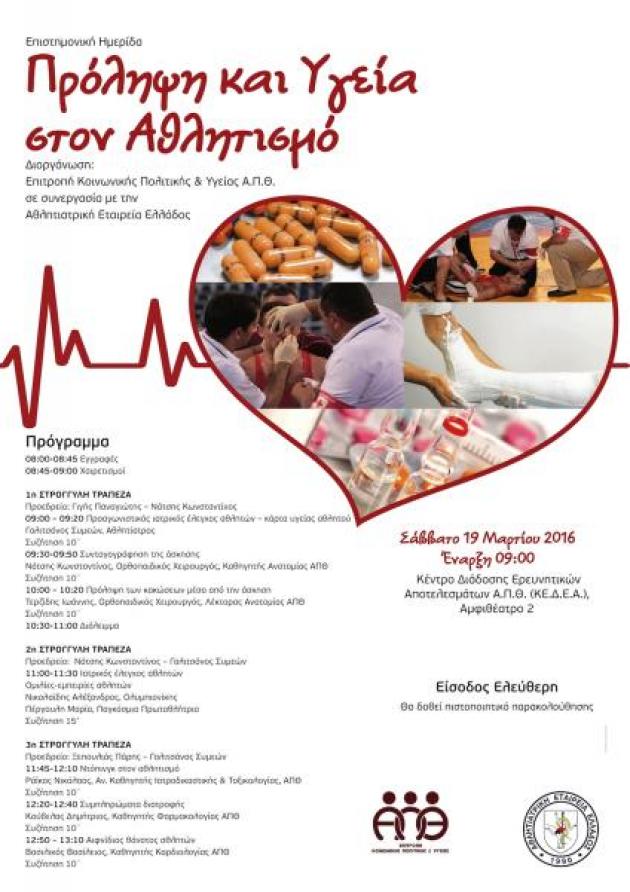 Η επιστημονική Ημερίδα διοργανώνεται από την Επιτροπή Κοινωνικής Πολιτικής και Υγείας του ΑΠΘ σε συνεργασία με την Αθλητιατρική Εταιρεία Ελλάδας και θα πραγματοποιηθεί το Σάββατο 19 Μαρτίου 2016 και ώρα 9.00, στο ΚΕ.Δ.Ε.Α. του ΑΠΘ.
