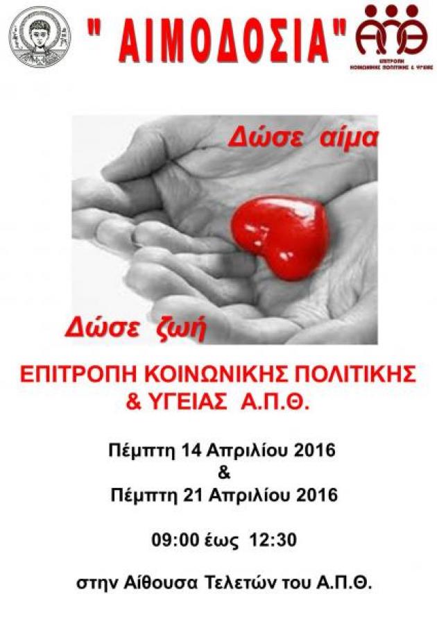 Εθελοντική αιμοδοσία, διοργανώνεται από την Επιτροπή Κοινωνικής Πολιτικής & Υγείας του ΑΠΘ και θα πραγματοποιηθεί την Πέμπτη 14 και την Πέμπτη 21 Απριλίου 2016 και ώρες 9:00 με 12:30, στην Αίθουσα Τελετών του ΑΠΘ, με στόχο την ενίσχυση της Τράπεζας Αίματος του ΑΠΘ.