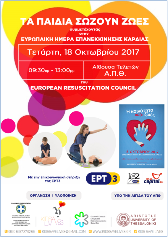 «Τα Παιδιά Σώζουν Ζωές» είναι ο τίτλος της ανοιχτής εκδήλωσης που θα πραγματοποιηθεί αύριο, Τετάρτη 18 Οκτωβρίου 2017 και ώρες 9:30-13:00, στην Αίθουσα Τελετών του ΑΠΘ. Η εκδήλωση τελεί υπό την αιγίδα του Αριστοτέλειου Πανεπιστημίου Θεσσαλονίκης και διοργανώνεται στο πλαίσιο της Πανευρωπαϊκής Ημέρας Επανεκκίνησης της Καρδιάς (Restart a Heart Day) και της Ευρωπαϊκής Εβδομάδας Ευαισθητοποίησης για την Καρδιακή Ανακοπή.