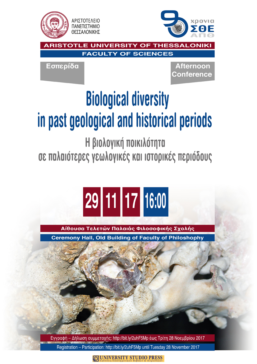 «Η βιολογική ποικιλότητα σε παλαιότερες γεωλογικές και ιστορικές περιόδους» είναι το θέμα της Εσπερίδας που διοργανώνει η Σχoλή Θετικών Επιστημών του Αριστοτέλειου Πανεπιστημίου Θεσσαλονίκης προς τιμήν του Καθηγητή του Πανεπιστημίου του Exeter του Ηνωμένου Βασιλείου Kevin J. Gaston και θα πραγματοποιηθεί την Τετάρτη 29 Νοεμβρίου 2017 και ώρα 16:00, στην αίθουσα Τελετών της παλαιάς Φιλοσοφικής Σχολής του ΑΠΘ.