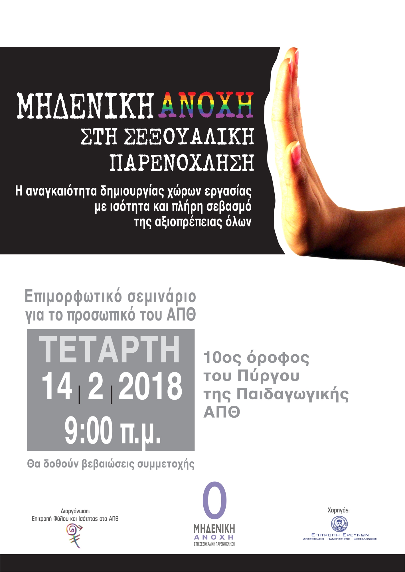 Η Επιτροπή Φύλου και Ισότητας του ΑΠΘ διοργανώνει επιμορφωτικό σεμινάριο για τις εργαζόμενες /τους εργαζομένους του Πανεπιστημίου με τίτλο «Μηδενική ανοχή στη σεξουαλική παρενόχληση-Η αναγκαιότητα δημιουργίας χώρων εργασίας με ισότητα και πλήρη σεβασμό της αξιοπρέπειας όλων».