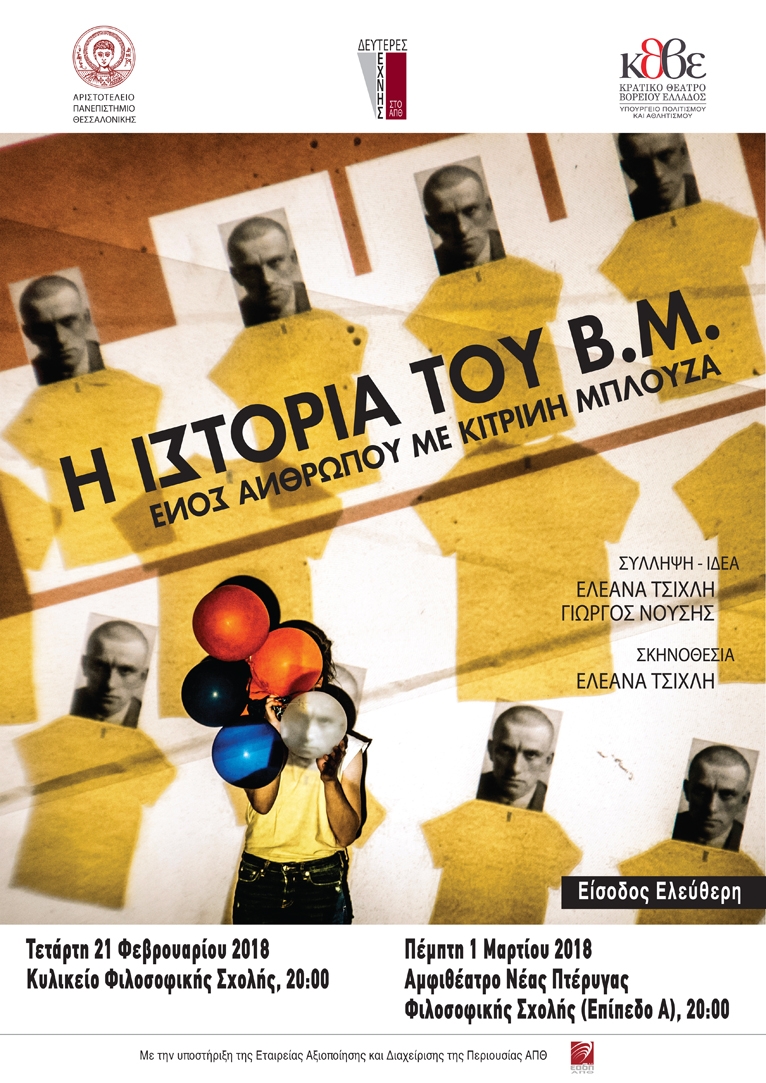 Μετά από έναν κύκλο επιτυχημένων παρουσιάσεων σε επιλεγμένους χώρους της Θεσσαλονίκης, η θεατρική δράση του Κρατικού Θεάτρου Βορείου Ελλάδος «H ιστορία του Β. Μ. – ενός ανθρώπου με κίτρινη μπλούζα», εντάσσεται στη σειρά πολιτιστικών εκδηλώσεων του Αριστοτελείου Πανεπιστημίου Θεσσαλονίκης «Δευτέρες της Τέχνης».
