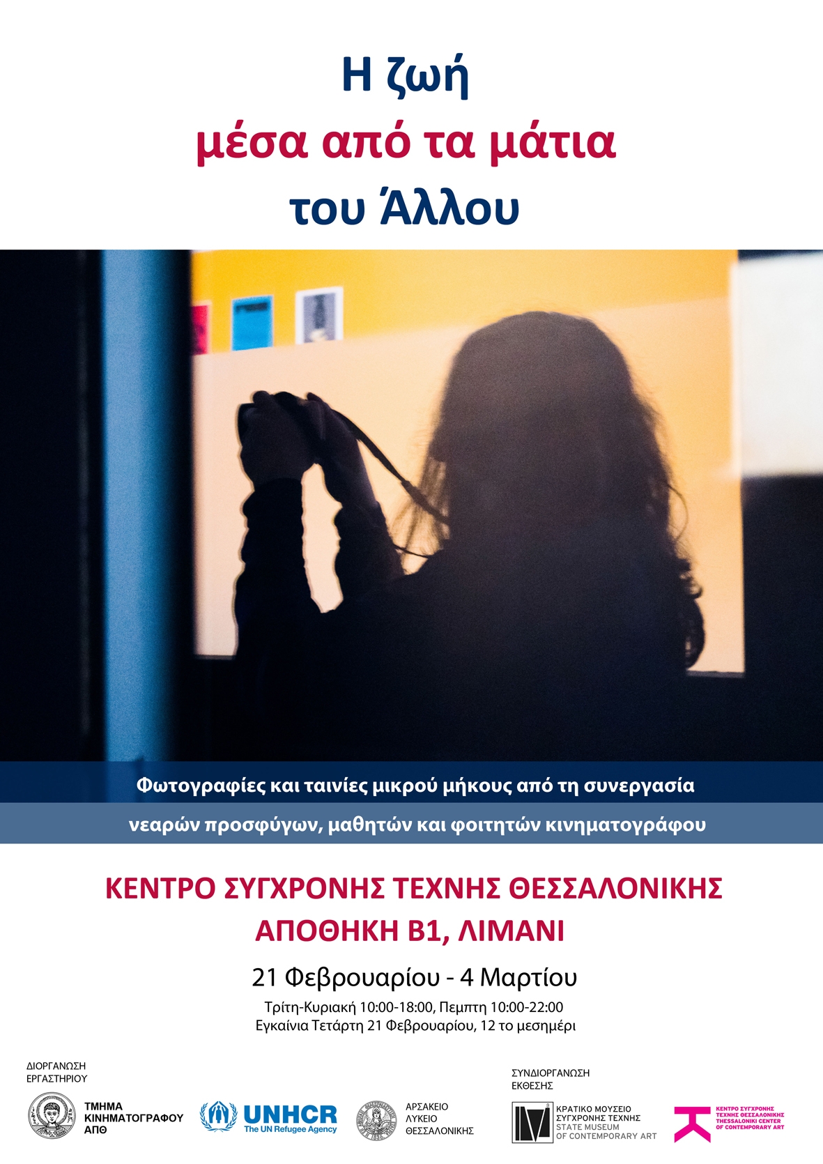 «Η ζωή μέσα από τα μάτια του άλλου» είναι ο τίτλος της Έκθεσης φωτογραφιών και ταινιών μικρού μήκους που διοργανώνουν το Τμήμα Κινηματογράφου του Αριστοτέλειου Πανεπιστημίου Θεσσαλονίκης (ΑΠΘ) και η Ύπατη Αρμοστεία του ΟΗΕ για τους Πρόσφυγες.