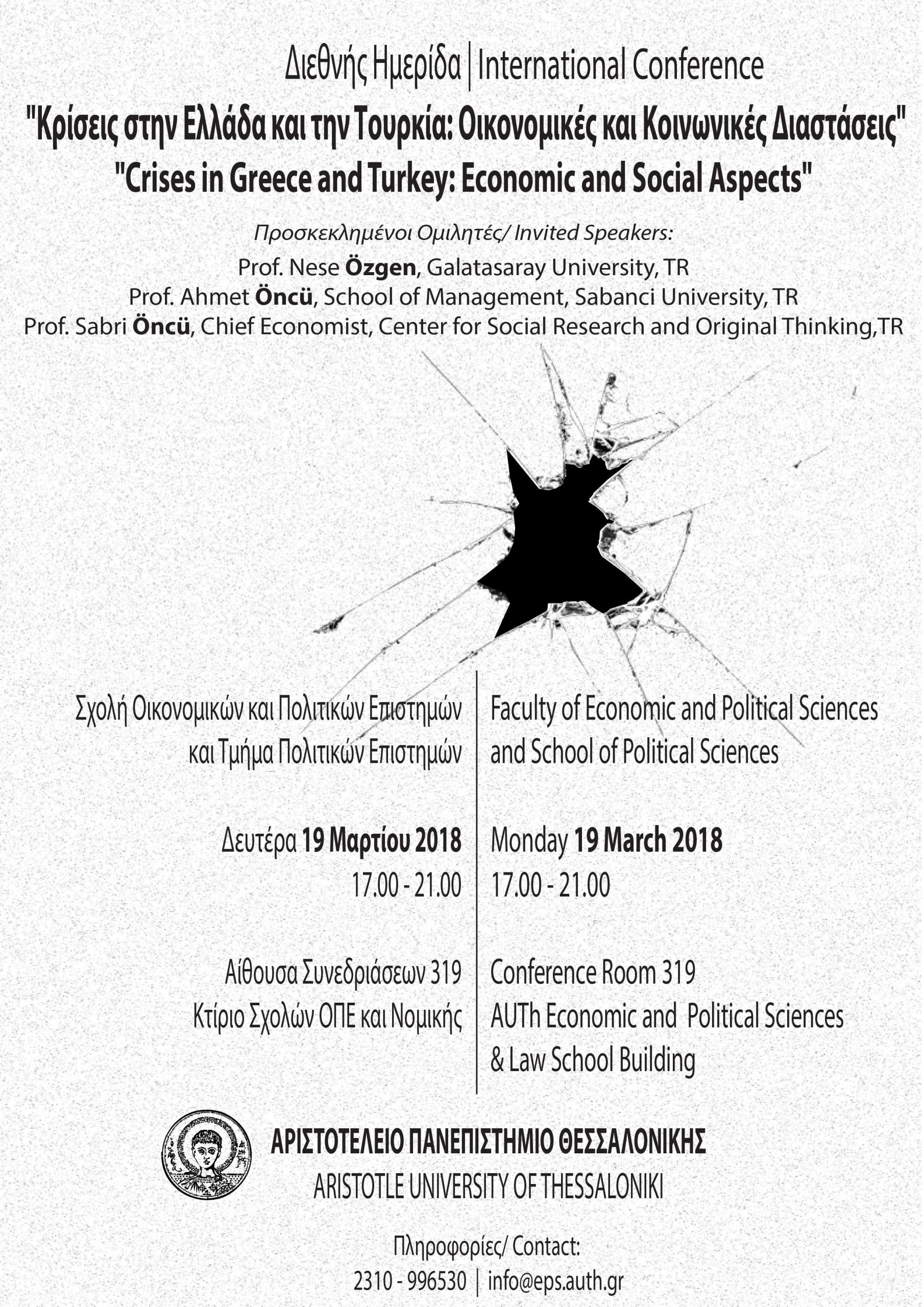 Το Τμήμα Πολιτικών Επιστημών του Αριστοτέλειου Πανεπιστημίου Θεσσαλονίκης, με την υποστήριξη της Σχολής Οικονομικών και Πολιτικών Επιστημών του ΑΠΘ, διοργανώνει διεθνή ημερίδα με τίτλο «Κρίσεις στην Ελλάδα και την Τουρκία: Οικονομικές και κοινωνικές διαστάσεις», τη Δευτέρα 19 Μαρτίου 2018 και ώρα έναρξης 17.00, στο Κτίριο των Σχολών Οικονομικών και Πολιτικών Επιστημών (ΟΠΕ) και Νομικής του ΑΠΘ (Αίθουσα Συνεδριάσεων 319, 3ος όροφος).