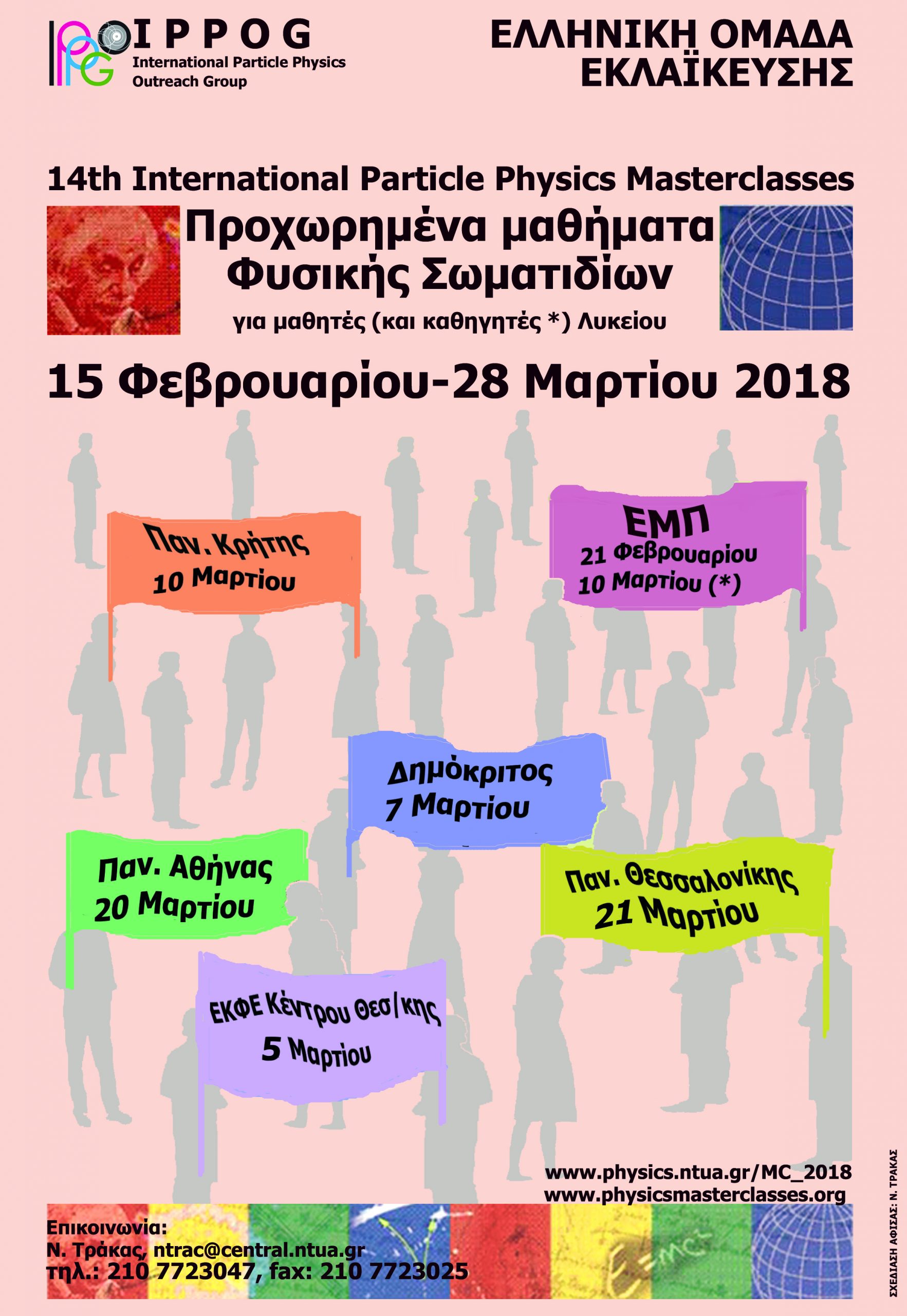 Η φετινή διοργάνωση των Masterclasses στη Φυσική Σωματιδίων (14th International Particle Physics Masterclasses 2018) πραγματοποιείται από τις 15 Φεβρουαρίου έως τις 28 Μαρτίου 2018 και συμμετέχουν σε αυτή 210 Πανεπιστήμια και ερευνητικά κέντρα από περισσότερες από 50 χώρες, τα οποία υποδέχονται πάνω από 10.000 μαθητές Λυκείου για να τους κάνουν, για μια μέρα, φυσικούς σωματιδίων.