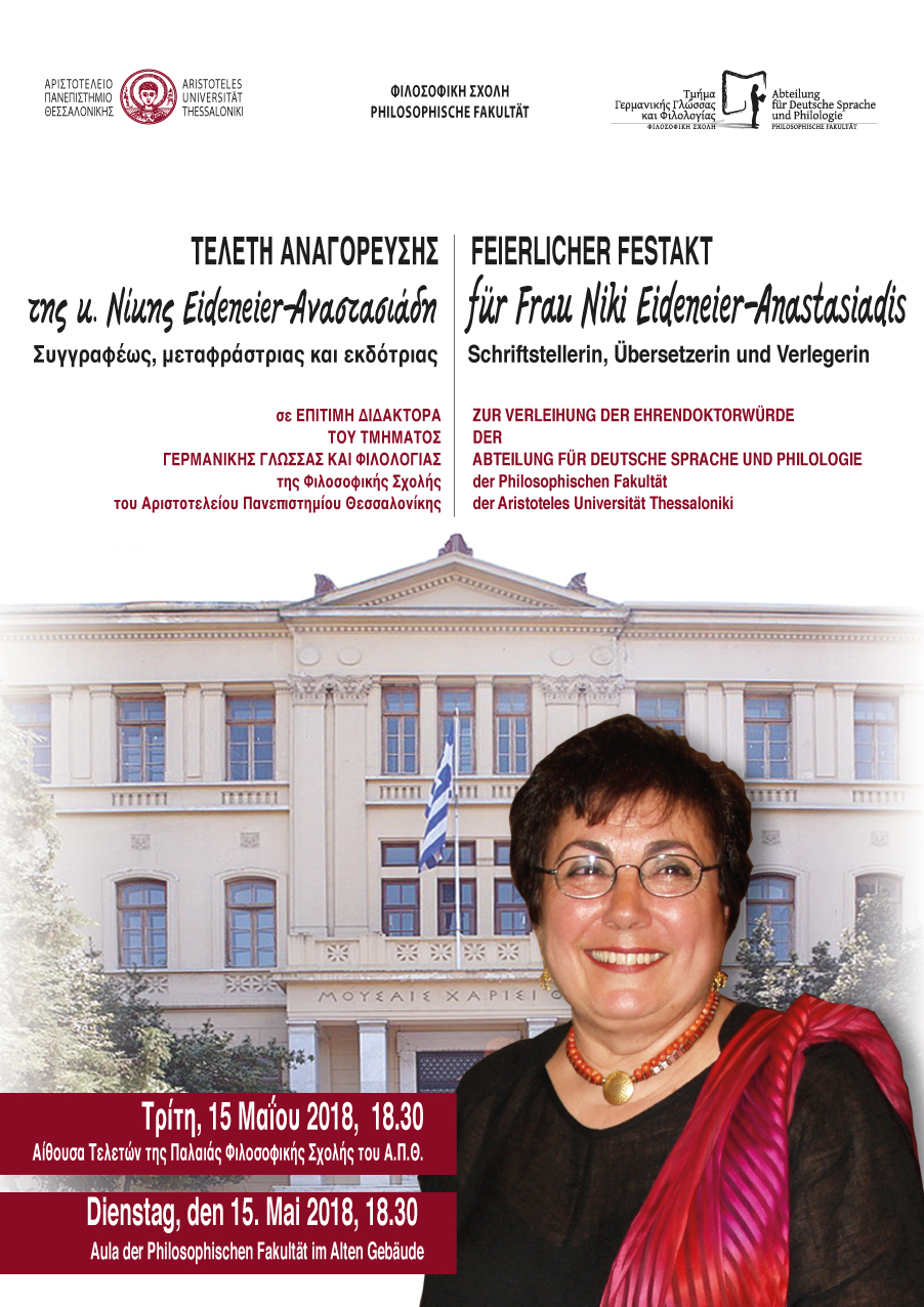 Σε Επίτιμη Διδάκτορα του Τμήματος Γερμανικής Γλώσσας και Φιλολογίας της Φιλοσοφικής Σχολής του ΑΠΘ θα αναγορευτεί η συγγραφέας, μεταφράστρια και εκδότρια Νίκη Eideneier-Αναστασιάδη. Η Τελετή Αναγόρευσης θα πραγματοποιηθεί την Τρίτη 15 Μαΐου 2018 και ώρα 18:30, στην Αίθουσα Τελετών «Αλέξανδρος Παπαναστασίου» της Παλαιάς Φιλοσοφικής Σχολής του ΑΠΘ.