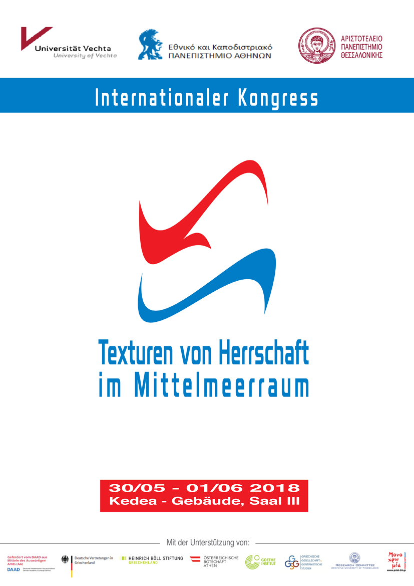 Διεθνές Συνέδριο με θέμα «Texturen von Herrschaft im Mittelmeerraum» («Αφηγήσεις κυριαρχίας στον μεσογειακό χώρο») συνδιοργανώνεται από τα Τμήματα Γερμανικής Γλώσσας και Φιλολογίας του Αριστοτέλειου Πανεπιστημίου Θεσσαλονίκης και του Εθνικού και Καποδιστριακού Πανεπιστημίου Αθηνών, καθώς και από το Πανεπιστήμιο Vechta της Γερμανίας, από την Τετάρτη 30 Μαΐου έως την Παρασκευή 1 Ιουνίου 2018, στο ΚΕΔΕΑ του ΑΠΘ.