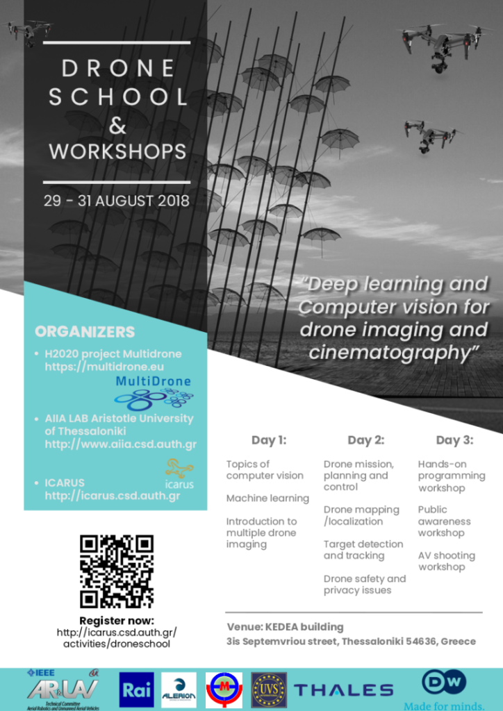 Η ημερίδα θα πραγματοποιηθεί την Παρασκευή 31 Αυγούστου 2018 και ώρες 15:30-19:00 στο Αμφιθέατρο ΙΙ του ΚΕΔΕΑ του ΑΠΘ (3ης Σεπτεμβρίου), στο πλαίσιο του θερινού σχολείου με θέμα «Drone School & Workshops: Deep learning and Computer vision for drone imaging and cinematography».
