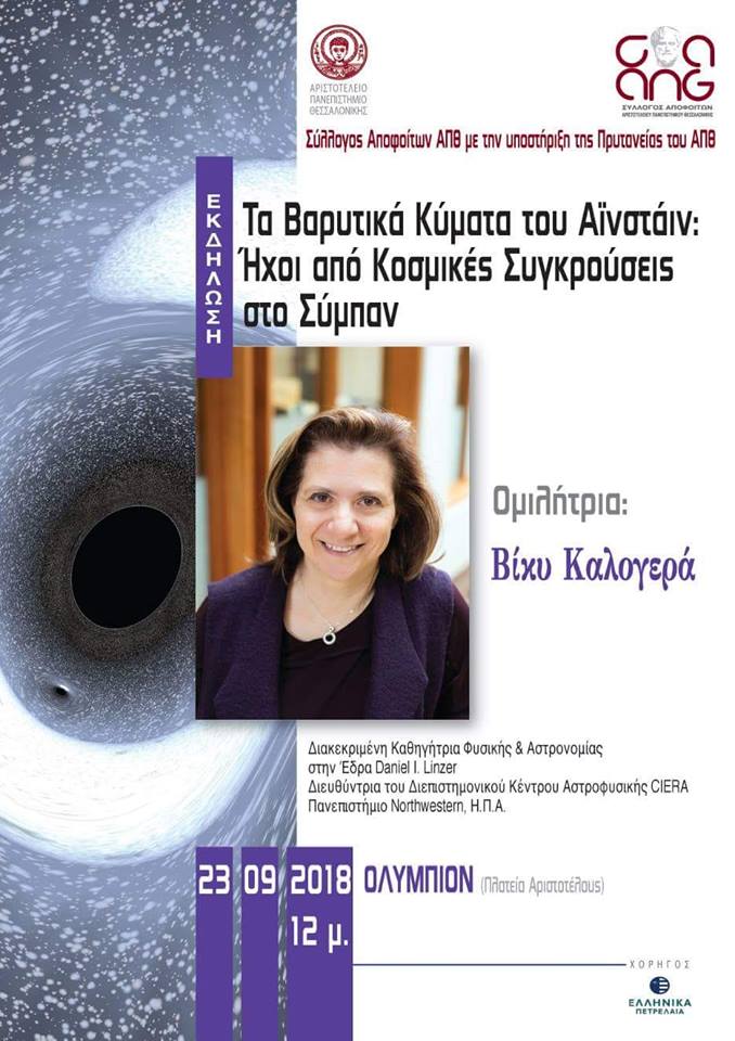 Εκδήλωση με θέμα «Τα Βαρυτικά Κύματα του Αϊνστάιν: Ήχοι από Κοσμικές Συγκρούσεις στο Σύμπαν» διοργανώνει ο Σύλλογος Αποφοίτων ΑΠΘ με την υποστήριξη της Πρυτανείας του Αριστοτελείου, την Κυριακή 23 Σεπτεμβρίου 2018 στις 12 μ., στο Κινηματοθέατρο «Ολύμπιον» (Πλατεία Αριστοτέλους).