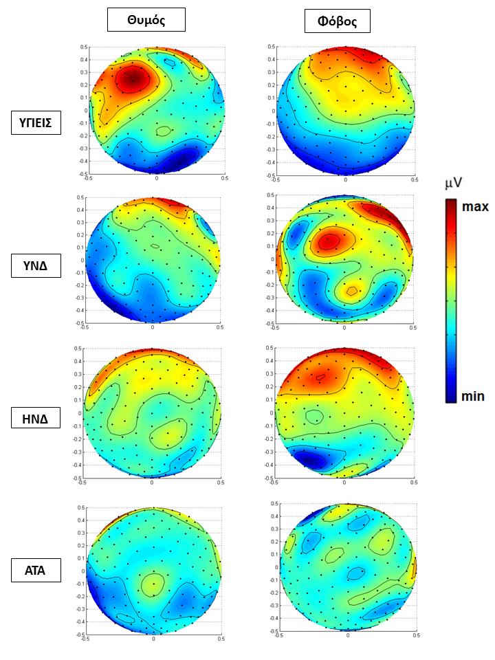Εικόνα 1: Τοπογραφική ανάλυση, που επιβεβαιώνει τον εντοπισμό διαφορών σε περιοχές του εγκεφάλου των συμμετεχόντων (υγιείς, ΥΝΔ, ΗΝΔ και ΑΤΑ) για τα δύο συναισθήματα (Θυμός και Φόβος).