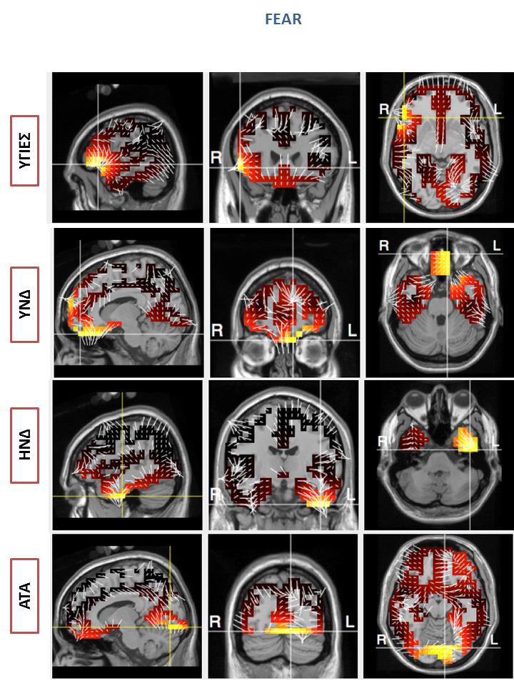 Εικόνα 2: Καταγραφή ενεργοποίησης και δραστηριότητας συγκεκριμένων περιοχών του εγκεφάλου των συμμετεχόντων (υγιείς, ΥΝΔ, ΗΝΔ και ΑΤΑ) για το συναίσθημα του Φόβου.