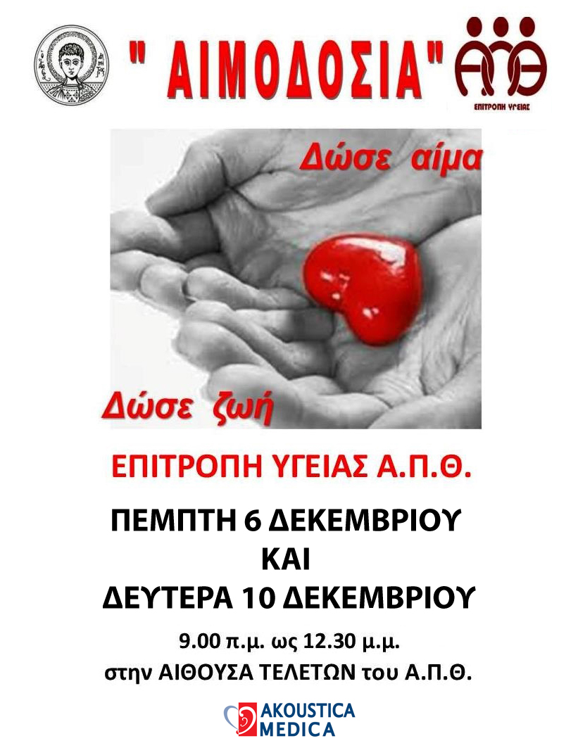 Εθελοντική αιμοδοσία διοργανώνεται από την Επιτροπή Υγείας του ΑΠΘ, την Πέμπτη 6 Δεκεμβρίου και τη Δευτέρα 10 Δεκεμβρίου και ώρες 9:00 με 12:30, στην Αίθουσα Τελετών του ΑΠΘ, με στόχο την ενίσχυση της Τράπεζας Αίματος του ΑΠΘ.