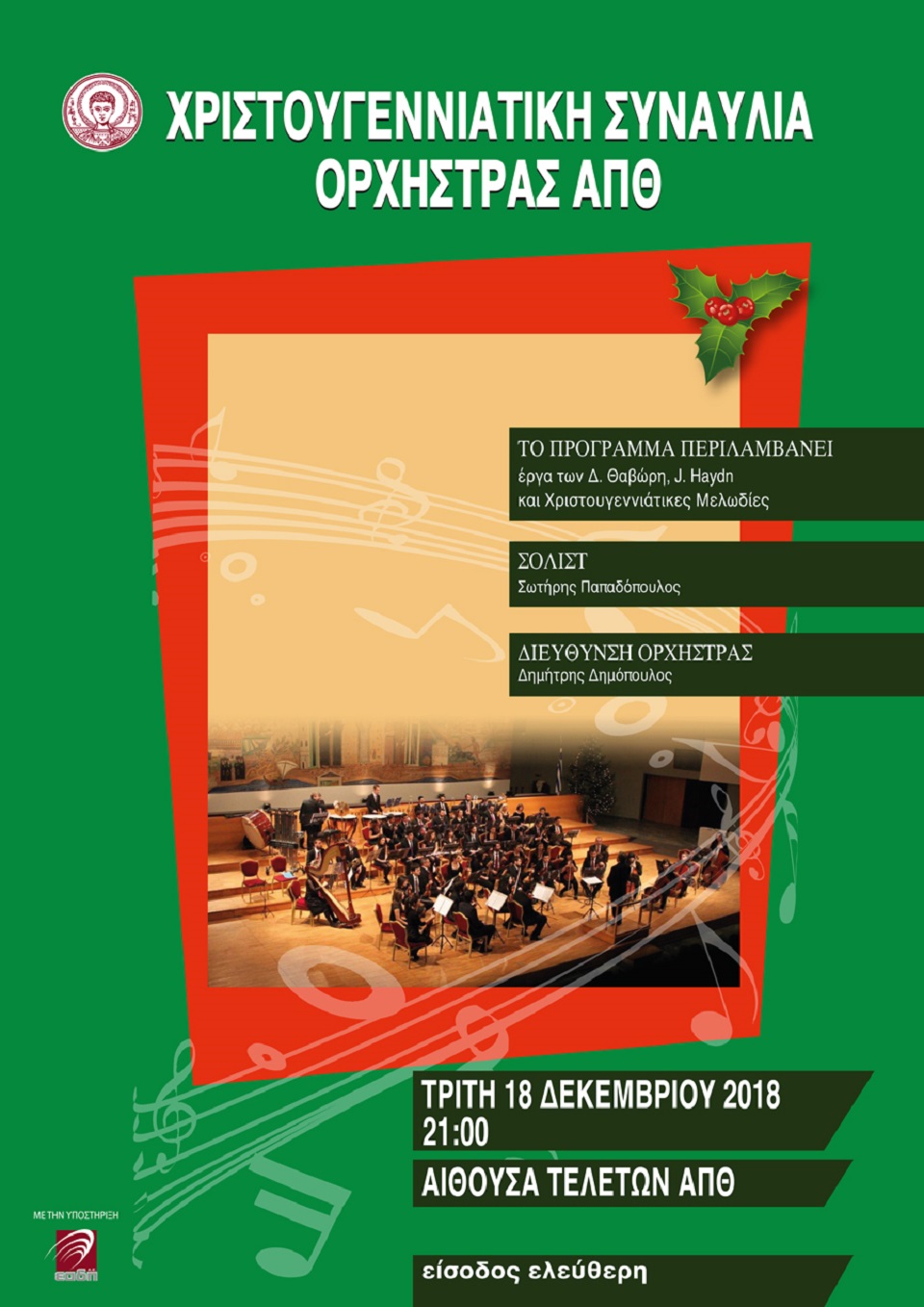 Την καθιερωμένη Χριστουγεννιάτικη Συναυλία της θα δώσει η Ορχήστρα του Αριστοτέλειου Πανεπιστημίου Θεσσαλονίκης την Τρίτη 18 Δεκεμβρίου 2018, στις 21:00, στην Αίθουσα Τελετών του ΑΠΘ.
