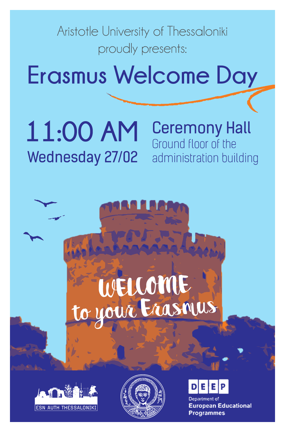 450 φοιτήτριες/φοιτητές που θα σπουδάσουν στο ΑΠΘ στο πλαίσιο διεθνών ανταλλαγών κατά το τρέχον εαρινό εξάμηνο υποδέχθηκαν εκπρόσωποι του Τμήματος Ευρωπαϊκών Εκπαιδευτικών Προγραμμάτων και του Δικτύου Φοιτητριών/Φοιτητών Erasmus (ESN) του ΑΠΘ, στην εκδήλωση με τίτλο «Welcome Day», που πραγματοποιήθηκε την Τετάρτη 27 Φεβρουαρίου 2019, στην Αίθουσα Τελετών του ΑΠΘ.