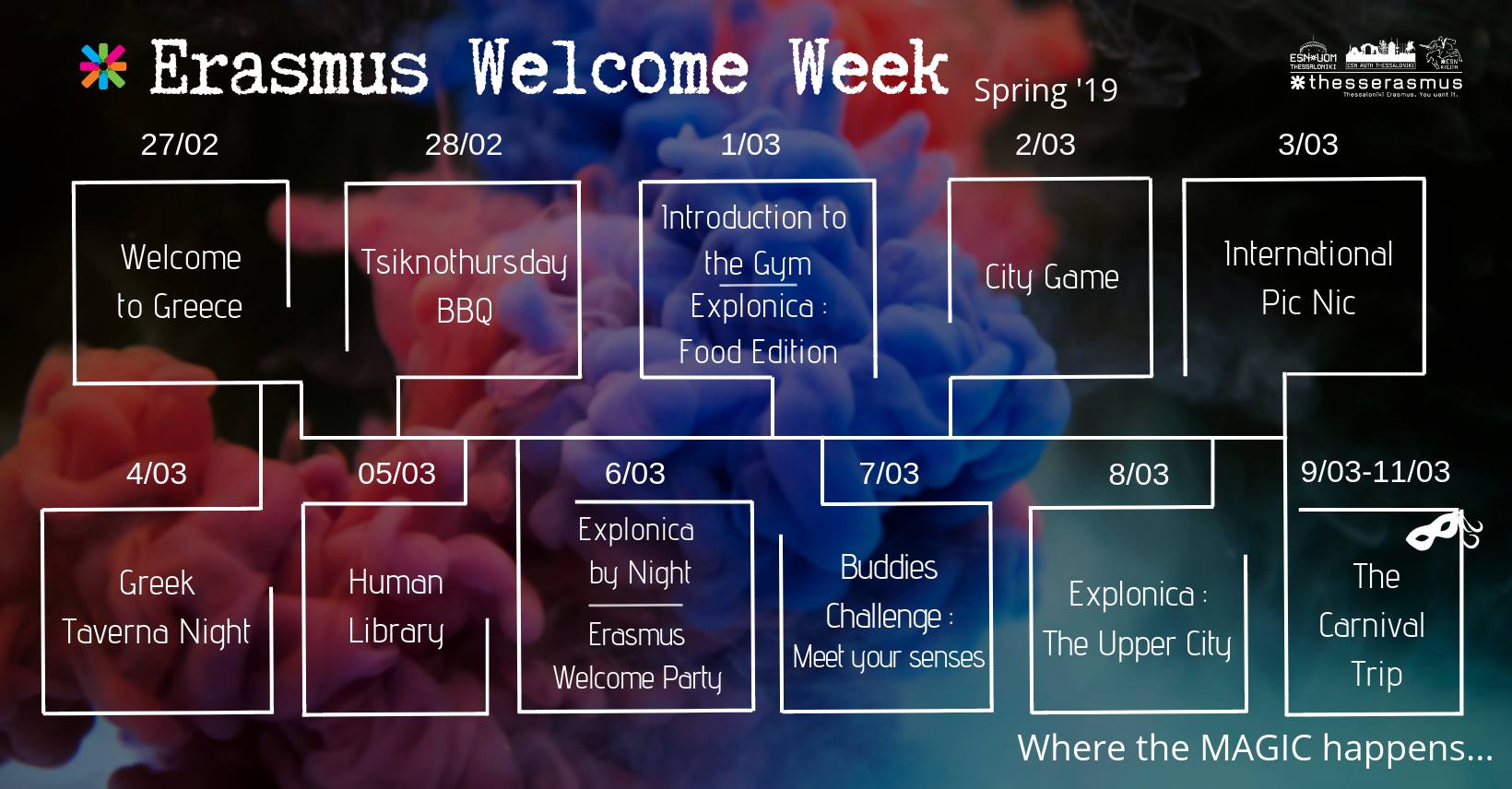 Η εκδήλωση «Welcome Day» σηματοδότησε και την έναρξη της «Εβδομάδας υποδοχής εισερχόμενων φοιτητών Erasmus», η οποία διοργανώνεται από το ESN και θα διαρκέσει ως τις 11 Μαρτίου 2019. Κατά τη διάρκειά της, οι φοιτήτριες/φοιτητές θα ξεναγηθούν στους χώρους και τις εγκαταστάσεις της Πανεπιστημιούπολης του ΑΠΘ, θα ενημερωθούν σχετικά με τις παρεχόμενες υπηρεσίες (Φοιτητική Λέσχη, Γυμναστήριο, Κέντρο Συμβουλευτικής και Ψυχολογικής Υποστήριξης, θεατρικές, μουσικές, χορευτικές, κινηματογραφικές, φωτογραφικές ομάδες κ.ά.).