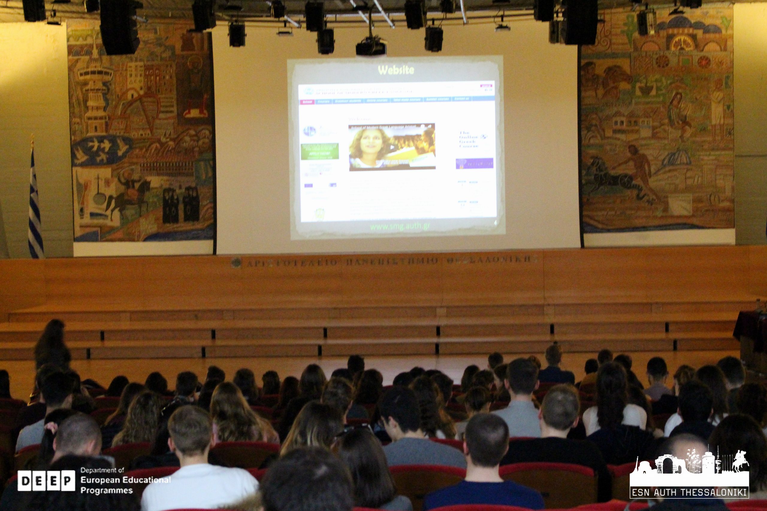 Κατά τη διάρκεια της εκδήλωσης υποδοχής, οι φοιτήτριες/φοιτητές ενημερώθηκαν για τις διαδικασίες εγγραφής και ένταξής τους στο ΑΠΘ, καθώς και για τις δομές και τις υπηρεσίες του Ιδρύματος που άπτονται των ενδιαφερόντων τους και στις οποίες μπορούν να έχουν πρόσβαση, όπως το Σχολείο Νέας Ελληνικής Γλώσσας, η Βιβλιοθήκη και Κέντρο Πληροφόρησης κ.ά., καθώς επίσης και για τις δραστηριότητες του ESN.