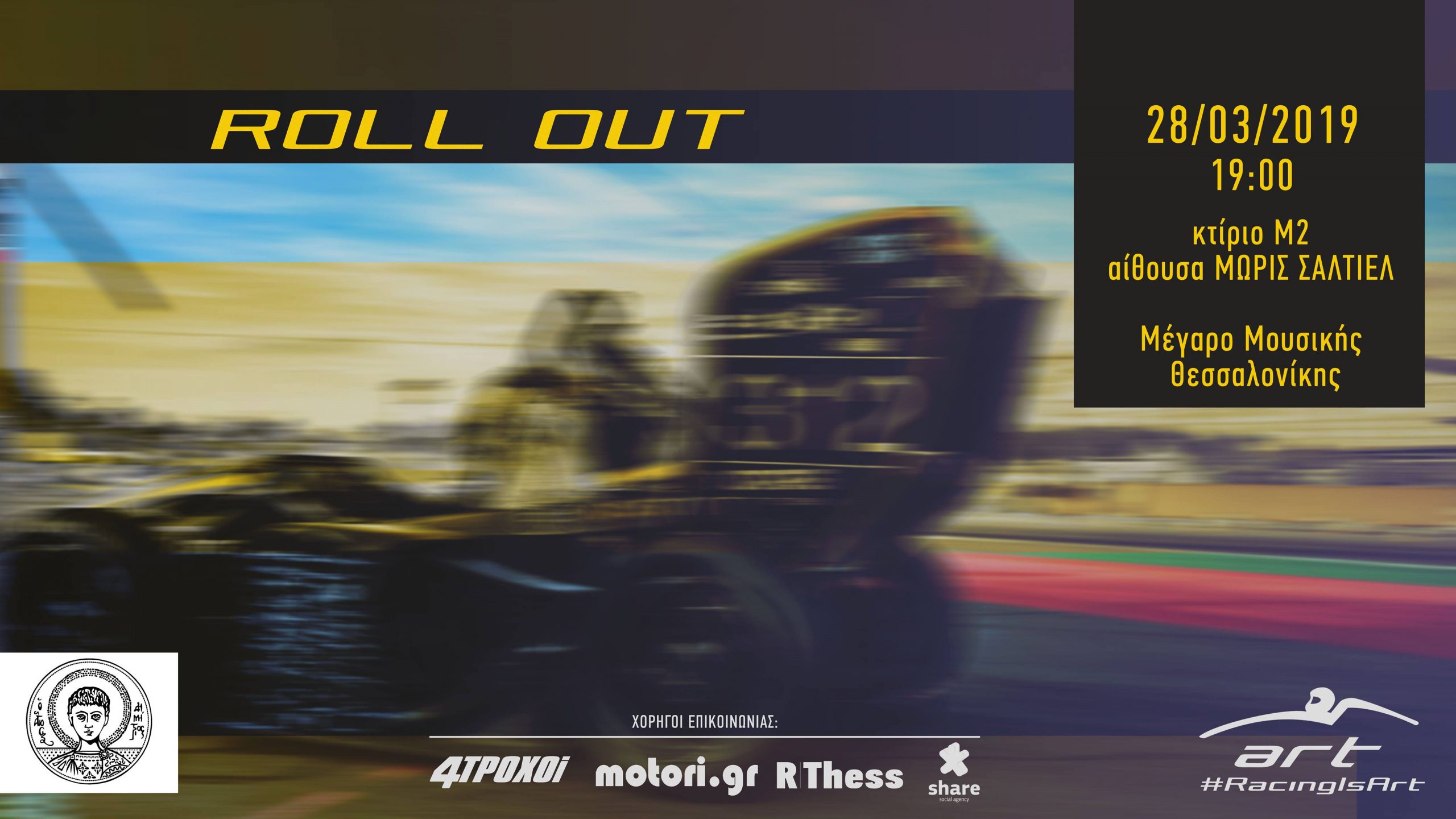Tα αποκαλυπτήρια του νέου μονοθεσίου της ΑRT-18 θα πραγματοποιήσει η φοιτητική ομάδα Aristotle Racing Team (ΑRT) του ΑΠΘ κατά τη διάρκεια της εκδήλωσης «Roll Out», την Πέμπτη 28 Μαρτίου 2019, στις 19.00, στην αίθουσα «Μωρίς Σαλτιέλ» του κτιρίου Μ2, στο Μέγαρο Μουσικής Θεσσαλονίκης.
