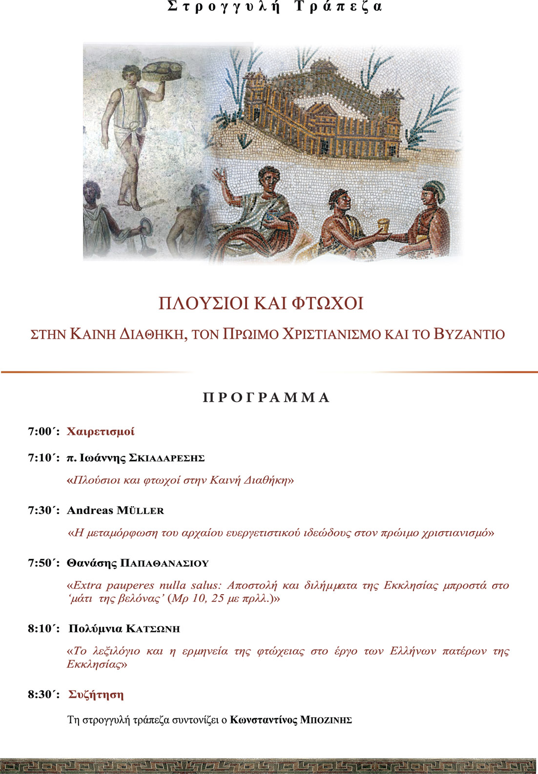 Θέλοντας να συμβάλει στον προβληματισμό που γεννήθηκε στην κοινωνία μέσα από την ανέχεια της πρόσφατης οικονομικής κρίσης, ο Τομέας Ιστορίας, Δόγματος, Διορθόδοξων και Διαχριστιανικών Σχέσεων του Τμήματος Ποιμαντικής και Κοινωνικής Θεολογίας του ΑΠΘ διοργανώνει την Πέμπτη 21 Μαρτίου 2019, στις 19.00, στρογγυλή τράπεζα με θέμα «Πλούσιοι και φτωχοί στην Καινή Διαθήκη, τον Πρώιμο Χριστιανισμό και το Βυζάντιο», στην Αίθουσα Συνεδριάσεων του Α’ ορόφου της Θεολογικής Σχολής.