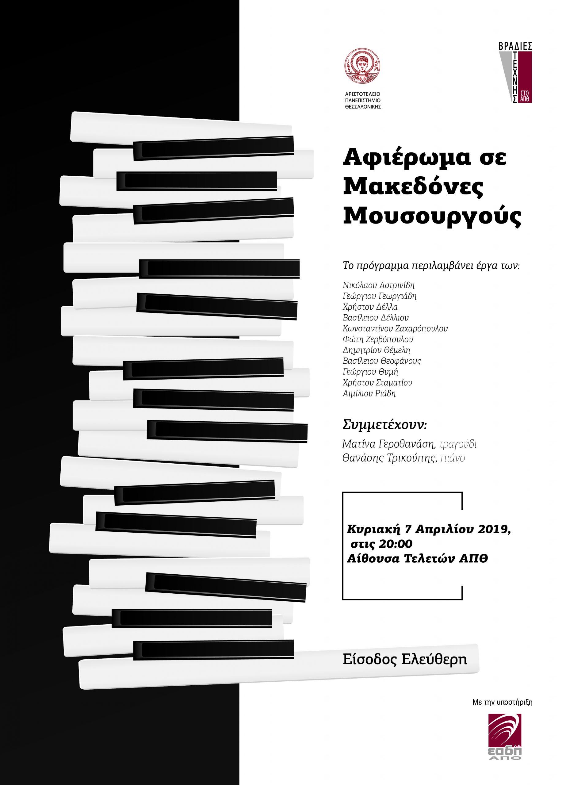 Την πολιτιστική κληρονομιά της Μακεδονίας «θα συστήσει» στο κοινό η μουσική εκδήλωση με τίτλο «Αφιέρωμα σε Μακεδόνες Μουσουργούς», που θα πραγματοποιηθεί την Κυριακή 7 Απριλίου 2019, στις 20.00, στην Αίθουσα Τελετών του ΑΠΘ, στο πλαίσιο του επιτυχημένου θεσμού «Βραδιές Τέχνης στο ΑΠΘ».