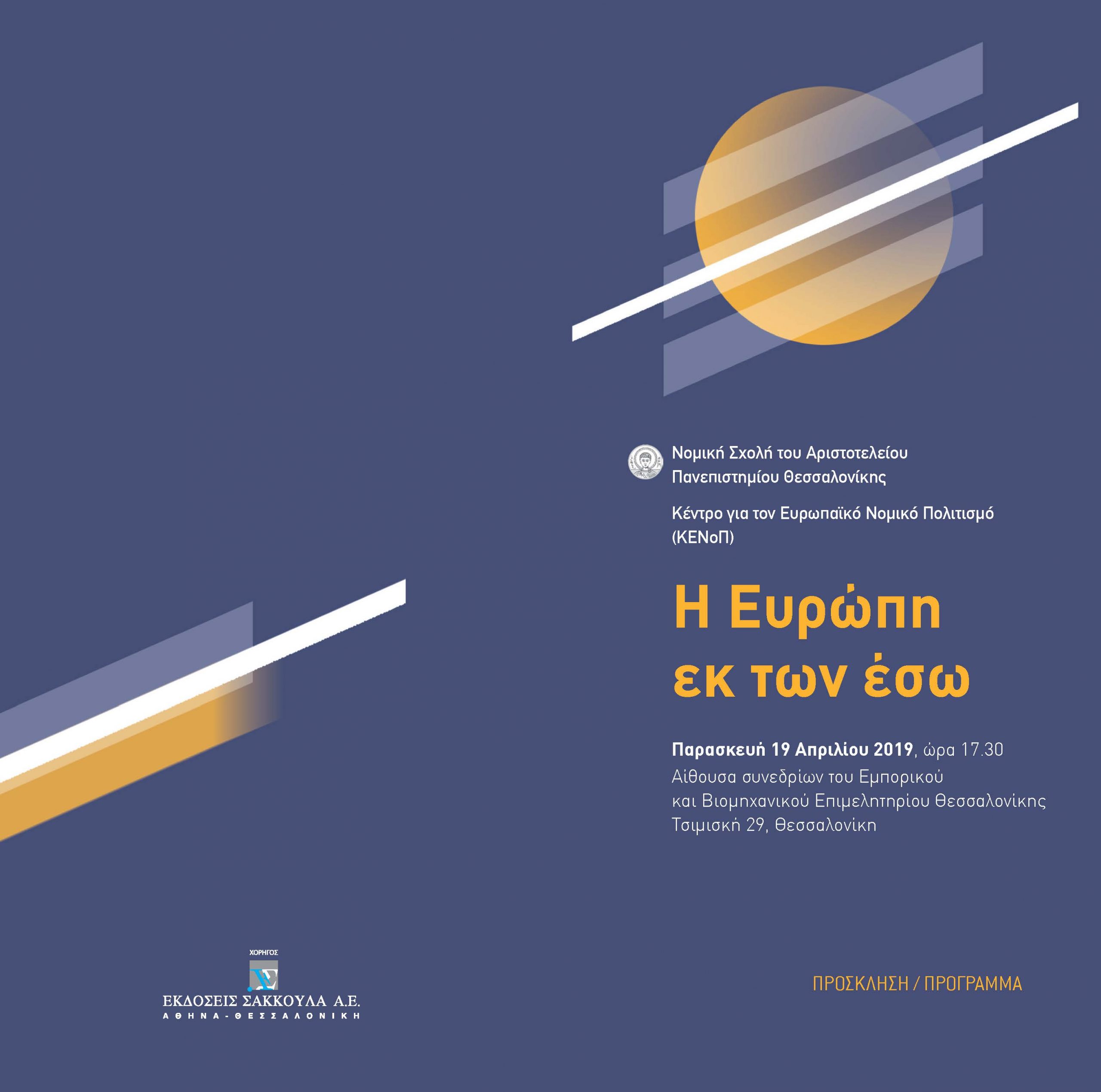 Το Κέντρο για τον Ευρωπαϊκό Νομικό Πολιτισμό (ΚΕΝοΠ) της Νομικής Σχολής του ΑΠΘ, το οποίο ιδρύθηκε πρόσφατα, ξεκινώντας τις δράσεις του διοργανώνει την πρώτη επιστημονική ημερίδα με τίτλο «Η Ευρώπη εκ των έσω», την Παρασκευή 19 Απριλίου 2019, στις 17.30, στην Αίθουσα Συνεδρίων του Εμπορικού και Βιομηχανικού Επιμελητηρίου Θεσσαλονίκης (Τσιμισκή 29).