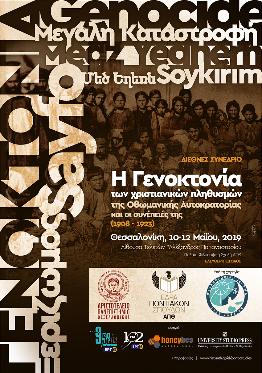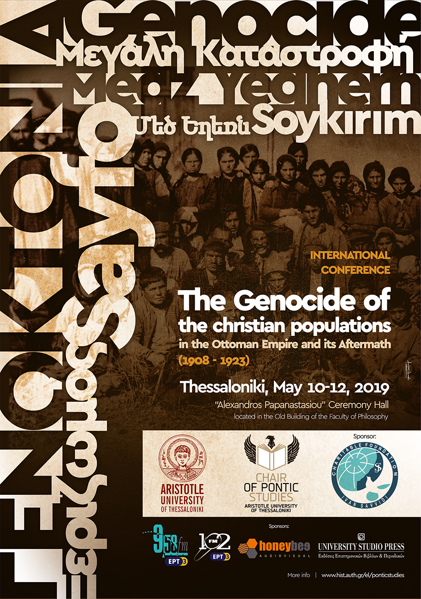 H Έδρα Ποντιακών Σπουδών του ΑΠΘ, με την υποστήριξη του Φιλανθρωπικού Ιδρύματος Ιβάν Σαββίδη, διοργανώνει Διεθνές Επιστημονικό Συνέδριο με θέμα «Η Γενοκτονία των χριστιανικών πληθυσμών της Οθωμανικής Αυτοκρατορίας και οι συνέπειές της (1908-1923)» (The Genocide of the Christian Populations of the Ottoman Empire and Its Aftermath 1908-1923), το οποίο θα πραγματοποιηθεί από την Παρασκευή 10 έως και την Κυριακή 12 Μαΐου 2019, στην Αίθουσα Τελετών «Αλέξανδρος Παπαναστασίου» της Παλαιάς Φιλοσοφικής Σχολής.