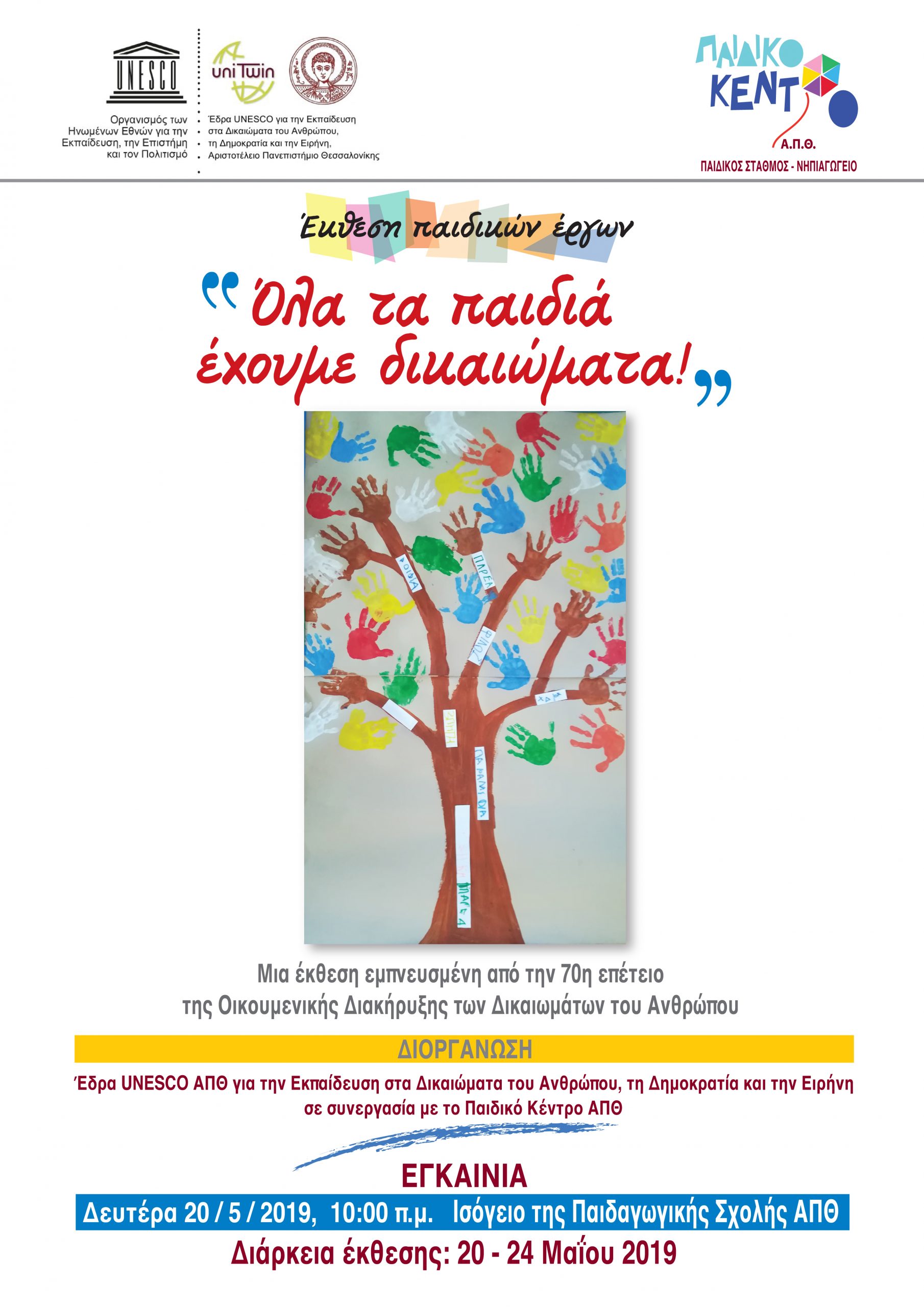 Τα έργα των παιδιών που συμμετείχαν στη δράση αυτή περιλαμβάνονται στην Έκθεση με τίτλο «Όλα τα παιδιά έχουμε δικαιώματα», την οποία διοργανώνει η Έδρα UNESCO του ΑΠΘ για την Εκπαίδευση στα Δικαιώματα του Ανθρώπου, τη Δημοκρατία και την Ειρήνη σε συνεργασία με το Παιδικό Κέντρο του ΑΠΘ.