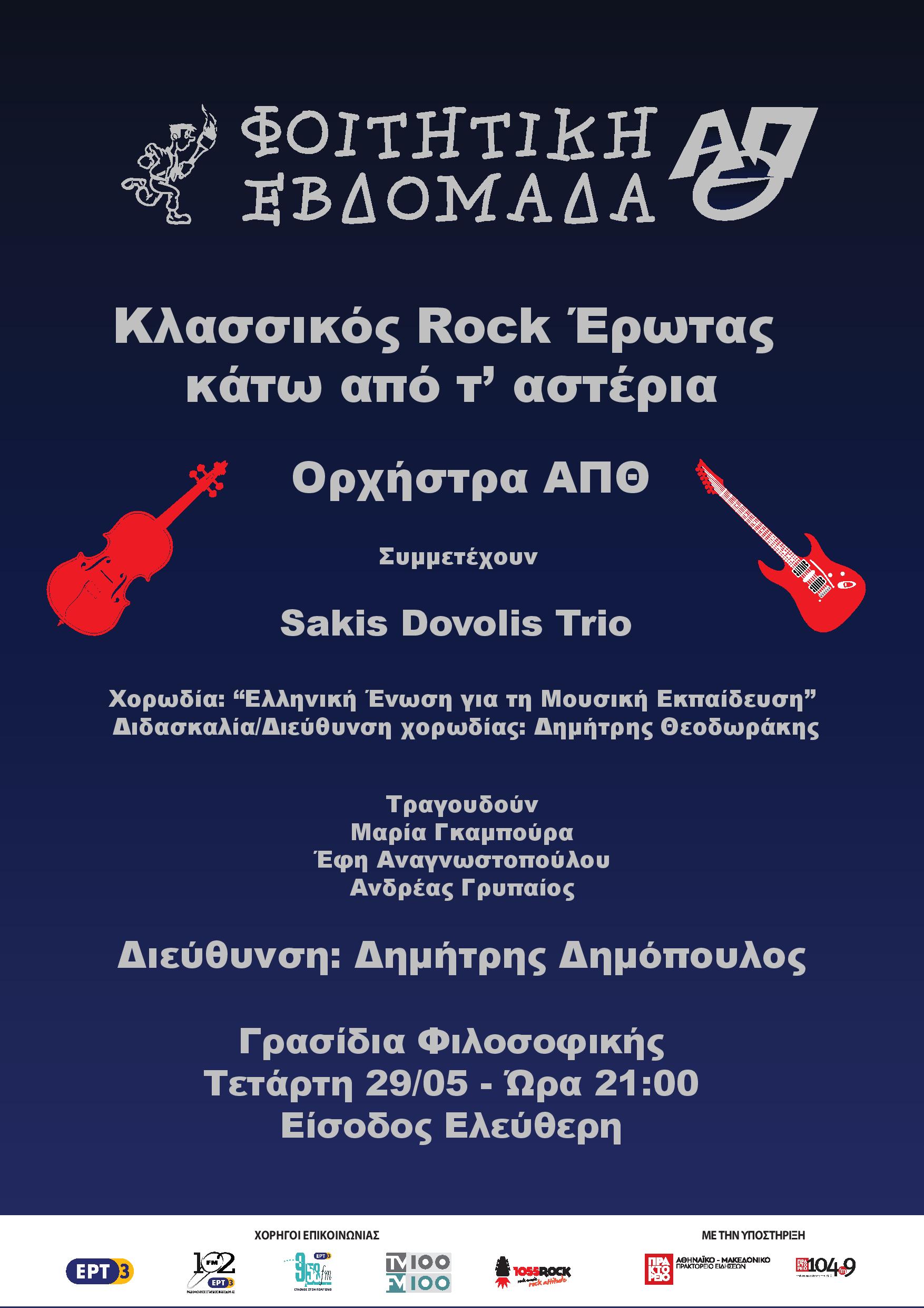 «Κλασικός Rock έρωτας κάτω από τ’ αστέρια!» είναι ο τίτλος της πολυαναμενόμενης συναυλίας, με κλασικά rock τραγούδια, τα οποία ερμηνεύει η Ορχήστρα του ΑΠΘ, η οποία θα πραγματοποιηθεί την Τετάρτη 29 Μαΐου 2019 και ώρα 21:00, στα γρασίδια της Φιλοσοφικής Σχολής.