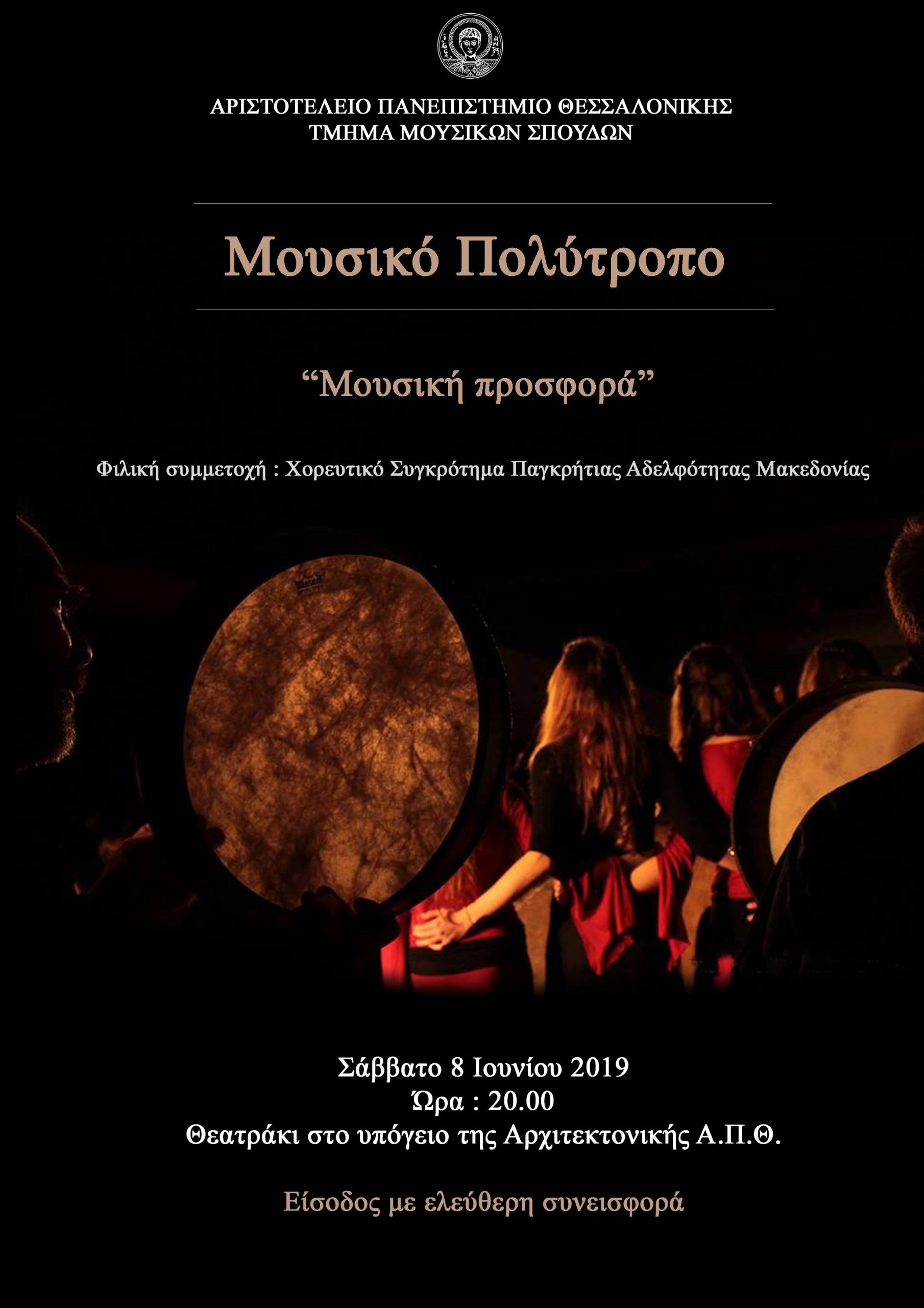 Τις δυνάμεις τους ενώνουν παλιά και νέα μέλη του «Μουσικού Πολυτρόπου» και τραγουδάνε σε μια βραδιά με φιλανθρωπικό χαρακτήρα, που θα πραγματοποιηθεί το Σάββατο 8 Ιουνίου 2019, στις 20.00, στο θεατράκι στο υπόγειο του κτιρίου του Τμήματος Αρχιτεκτόνων Μηχανικών, της Πολυτεχνικής Σχολής του ΑΠΘ.