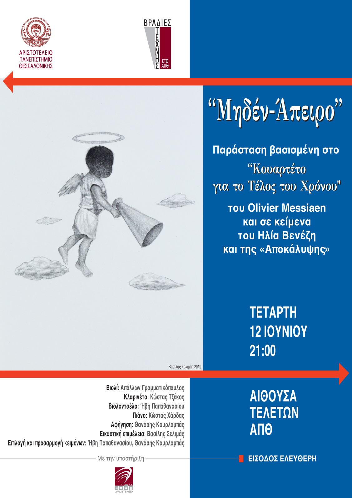 Το «Κουαρτέτο για το Τέλος του Χρόνου», του Γάλλου δημιουργού Olivier Messiaen, αποσπάσματα από «Το Νούμερο 31328», του Ηλία Βενέζη, και εδάφια από την «Αποκάλυψη» συνθέτουν την πρωτότυπη μουσική παράσταση «Μηδέν-Άπειρο» που θα παρουσιάσει το Τμήμα Μουσικών Σπουδών της Σχολής Καλών Τεχνών του ΑΠΘ, την Τετάρτη 12 Ιουνίου 2019, στις 21.00, στην Αίθουσα Τελετών του ΑΠΘ.