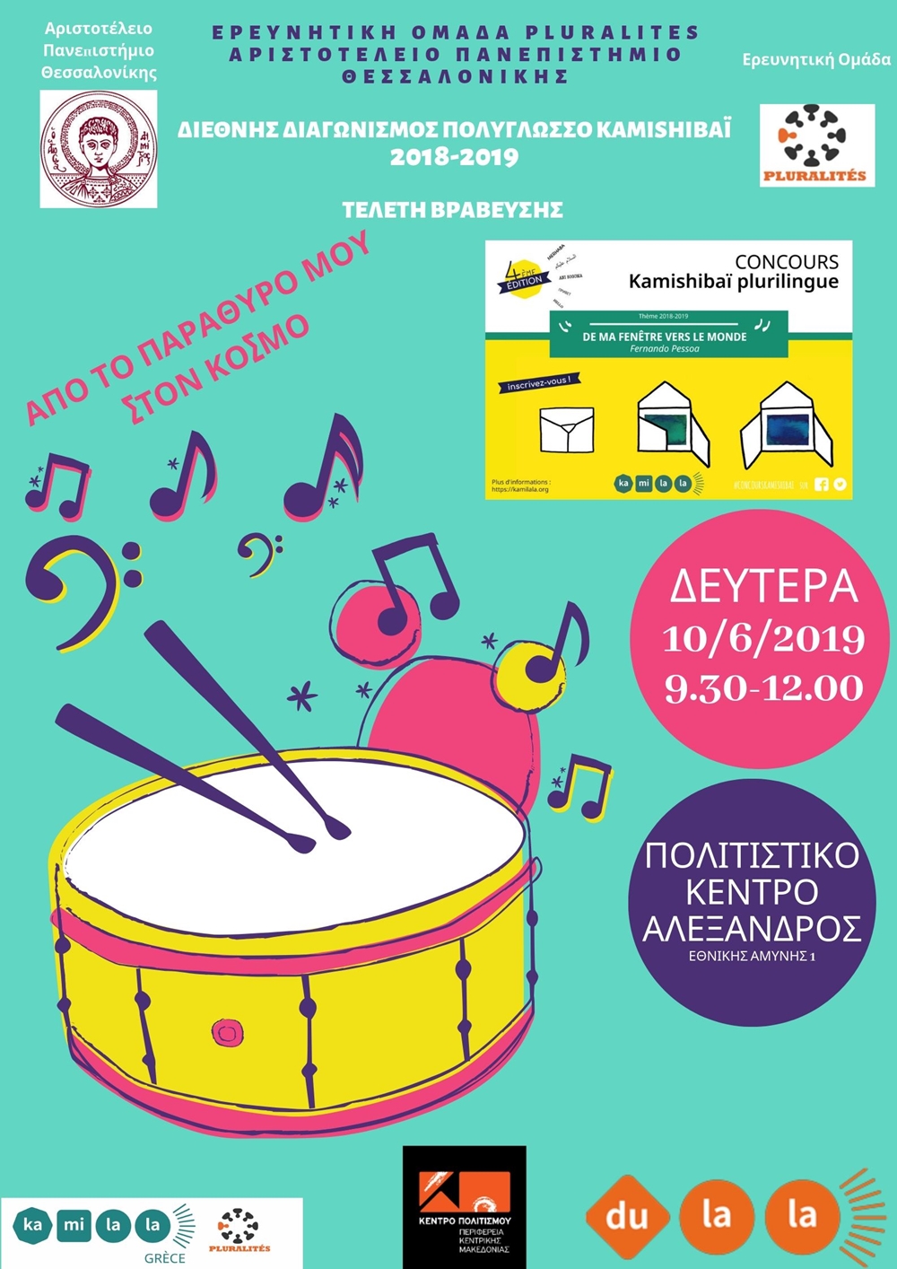 Η ερευνητική ομάδα «Pluralités» του Τμήματος Γαλλικής Γλώσσας και Φιλολογίας του ΑΠΘ, διοργάνωσε σε συνεργασία με τον γαλλικό επιστημονικό σύλλογο DULALA (D’une Langue à l’Autre) και διεθνείς φορείς, το σχολικό έτος 2018-2019, τον διεθνή διαγωνισμό για την πολυγλωσσία και την πολυπολιτισμικότητα με τίτλο «Kamishibaï Plurilingue», ο οποίος πραγματοποιήθηκε για πρώτη φορά στην Ελλάδα.