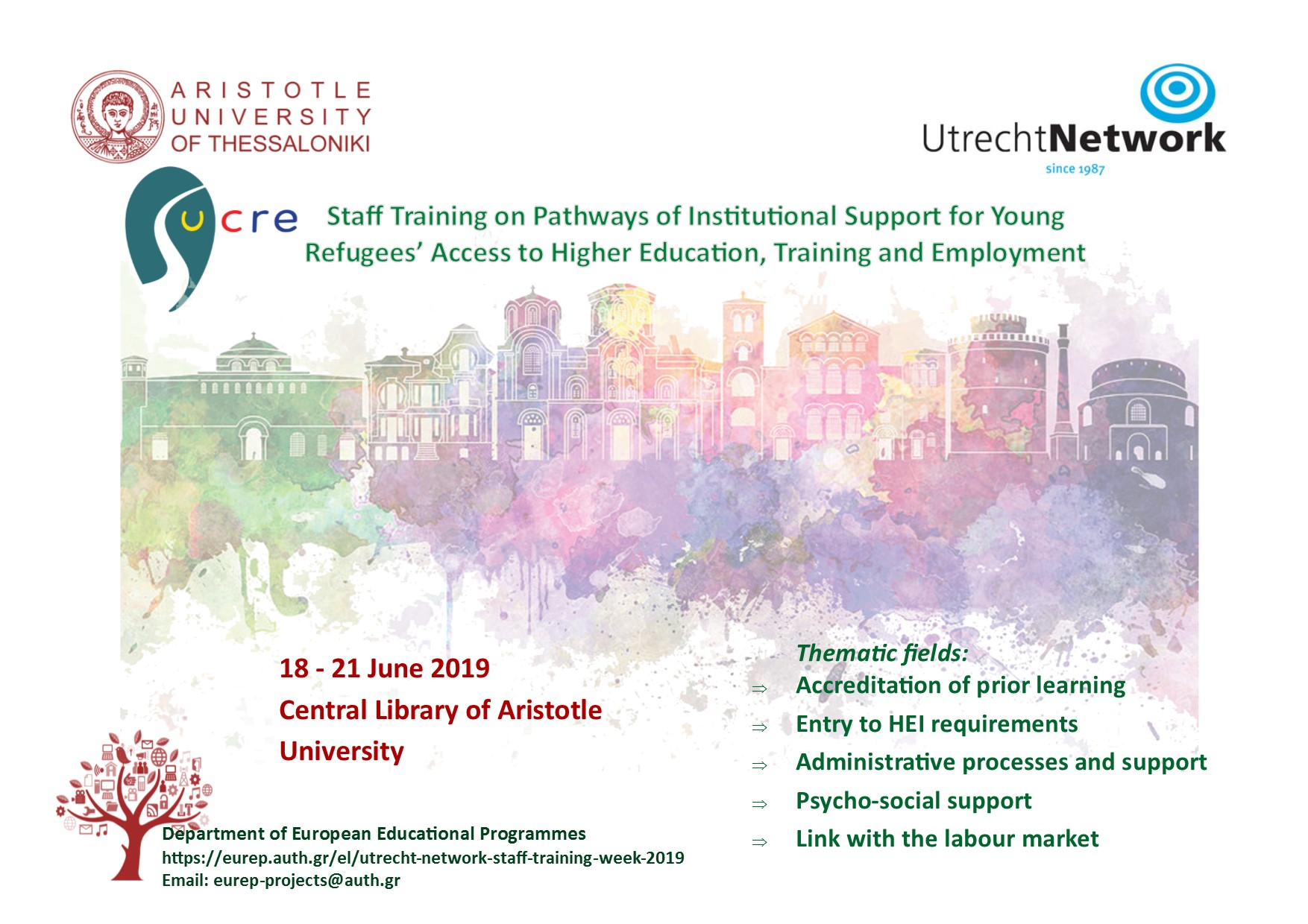 Το Τμήμα Eυρωπαϊκών Εκπαιδευτικών Προγραμμάτων του Αριστοτέλειου Πανεπιστημίου Θεσσαλονίκης, με την υποστήριξη του Δικτύου Ουτρέχτης (Utrecht Network), διοργανώνει την Εβδομάδα Επιμόρφωσης Προσωπικού για την «Υποστήριξη της πρόσβασης των νέων Προσφύγων στην Τριτοβάθμια Εκπαίδευση, την Επιμόρφωση και την Εργασία» («Staff Training on Pathways of Institutional Support for Young Refugees Access to Higher Education, Training and Employment») από την Τρίτη 18 έως την Παρασκευή 21 Ιουνίου 2019, στο ΑΠΘ.