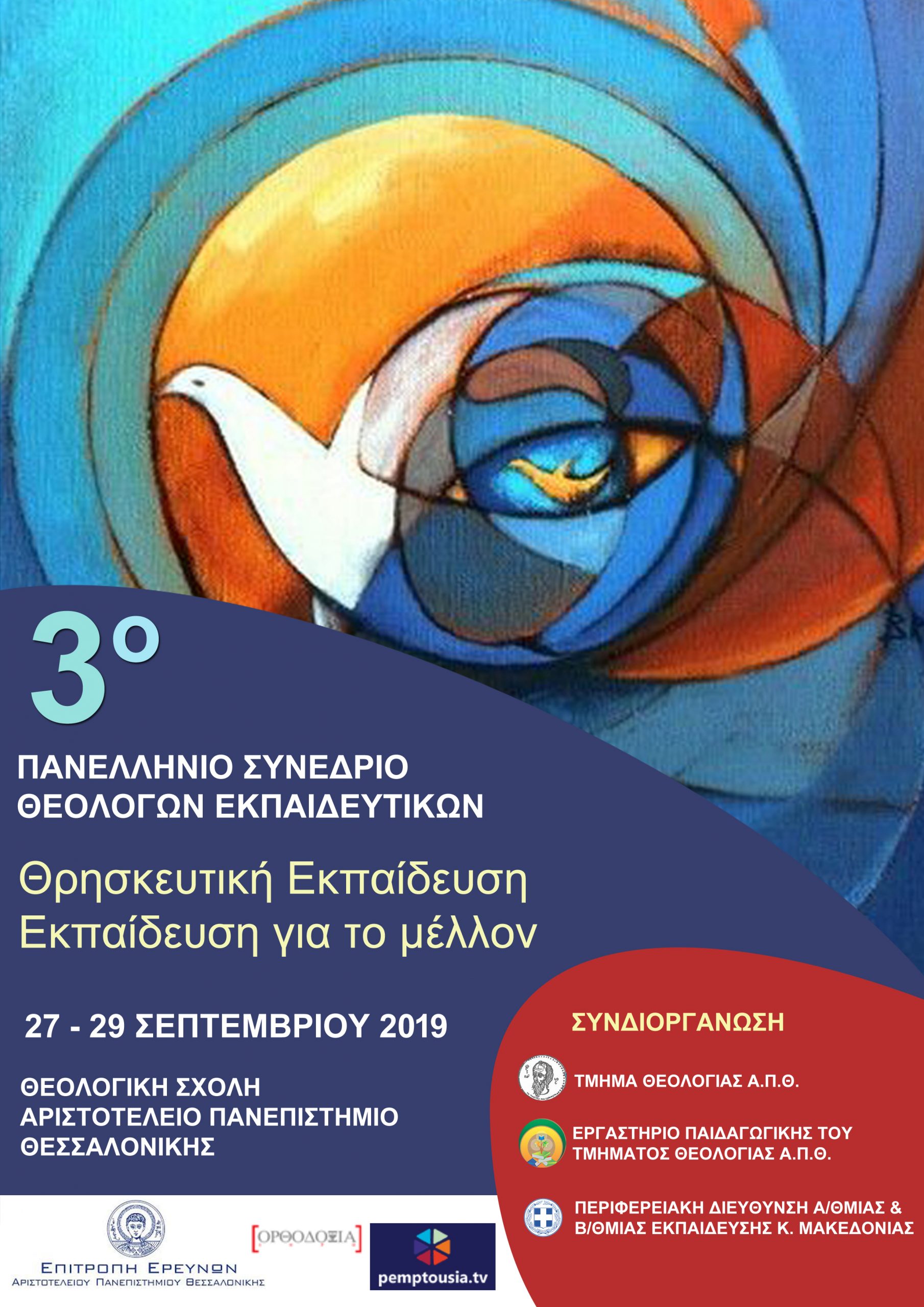 Το 3ο Πανελλήνιο Επιστημονικό Συνέδριο Θεολόγων Εκπαιδευτικών, με διεθνή συμμετοχή, με τίτλο «Θρησκευτική Εκπαίδευση-Εκπαίδευση για το μέλλον» διοργανώνουν από κοινού το Τμήμα Θεολογίας του Αριστοτέλειου Πανεπιστημίου Θεσσαλονίκης, το Εργαστήριο Παιδαγωγικής του Τμήματος Θεολογίας του ΑΠΘ και η Περιφερειακή Διεύθυνση Πρωτοβάθμιας και Δευτεροβάθμιας Εκπαίδευσης Κεντρικής Μακεδονίας.