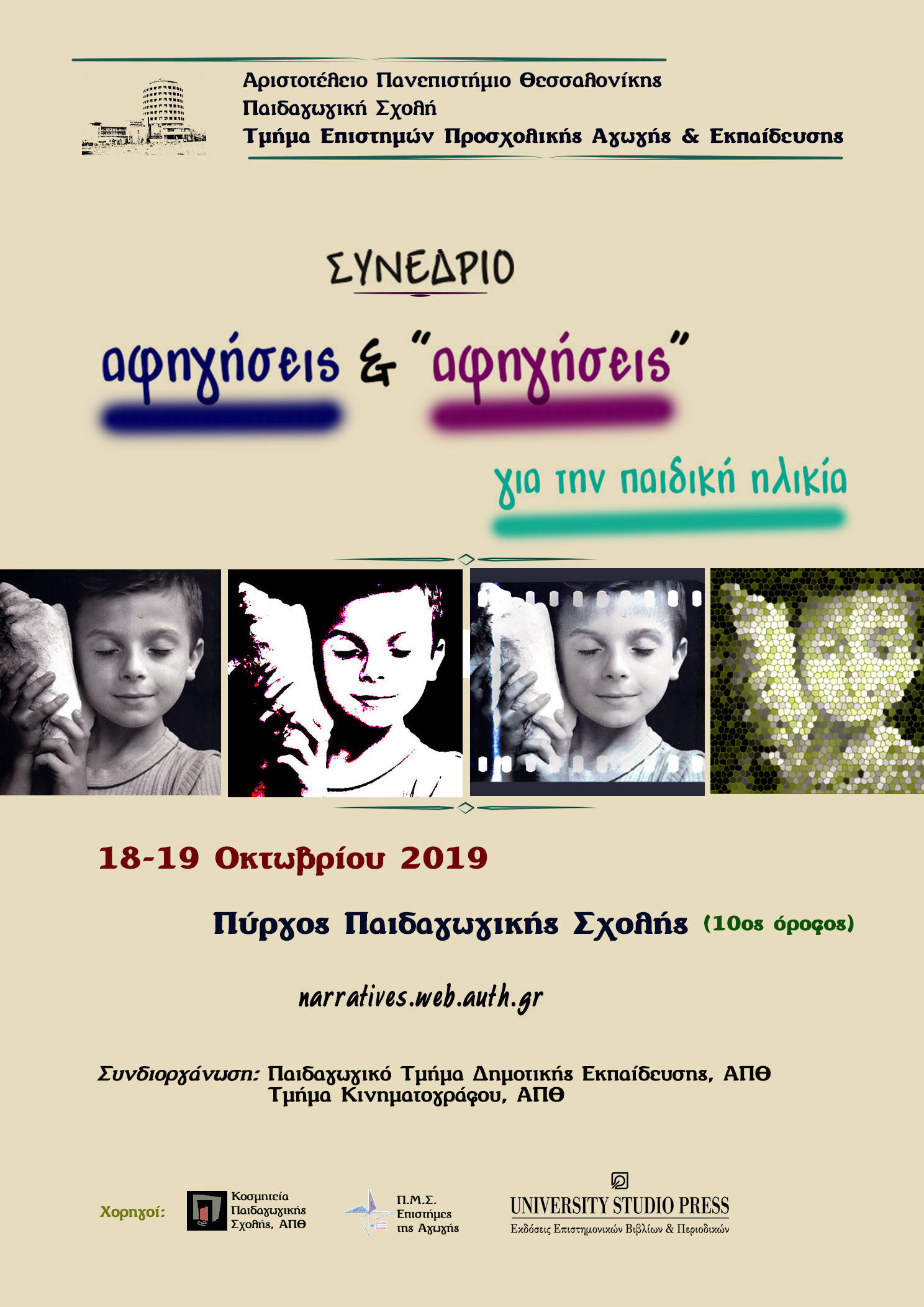 Το Τμήμα Επιστημών Προσχολικής Αγωγής και Εκπαίδευσης (ΤΕΠΑΕ) σε συνεργασία με το Παιδαγωγικό Τμήμα Δημοτικής Εκπαίδευσης και το Τμήμα Κινηματογράφου του ΑΠΘ διοργανώνουν Συνέδριο με θέμα «Αφηγήσεις και αφηγήσεις για την Παιδική Ηλικία», το οποίο θα πραγματοποιηθεί την Παρασκευή 18 (ώρα έναρξης 16.15) και το Σάββατο 19 Οκτωβρίου 2019, στον Πύργο της Παιδαγωγικής Σχολής του ΑΠΘ (10ος όροφος, Αίθουσα Εκδηλώσεων).